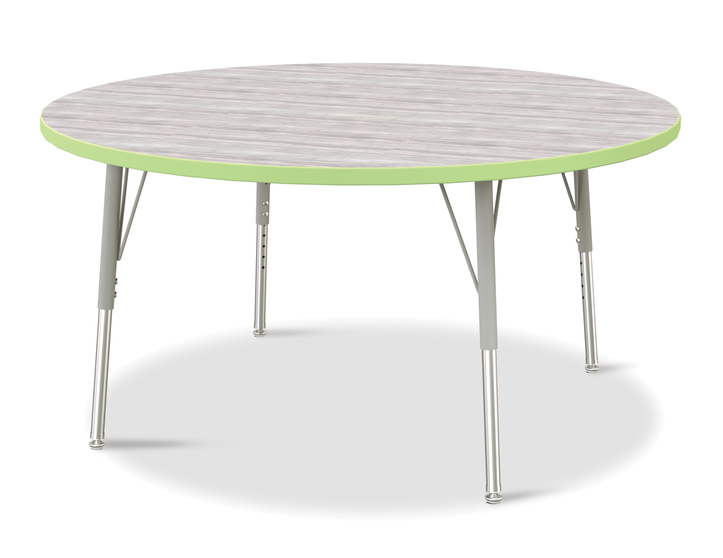 These round tables are excellent for allowing children to interact with each other during projects. Accommodates up to 8 chairs. The legs feature glides that reduce noise, prevent snags, and resist rust. Driftwood Gray laminate tabletop with Key Lime TRUEdge and gray legs.KYDZSafe edges. KYDZStrong construction. TRUEdge. Choose from multiple tabletop and TRUEdge color combinations. Thermally Fused Laminate tabletops 1-1/8â thick. Quick mount legs with minimal assembly. Legs adjust in one-inch increments with the extra-safe dual-screw leg adjustability system. Helpful Hint: Most children require elementary size tables tiny tables typically fit children just 1 to 2 years old. Adjusts from 15" to 24" high. See cleaning recommendations at www.jonti-craft.com/cleaning.Product Height (inches):15-24Product Width (inches):48Product Depth (inches: 48