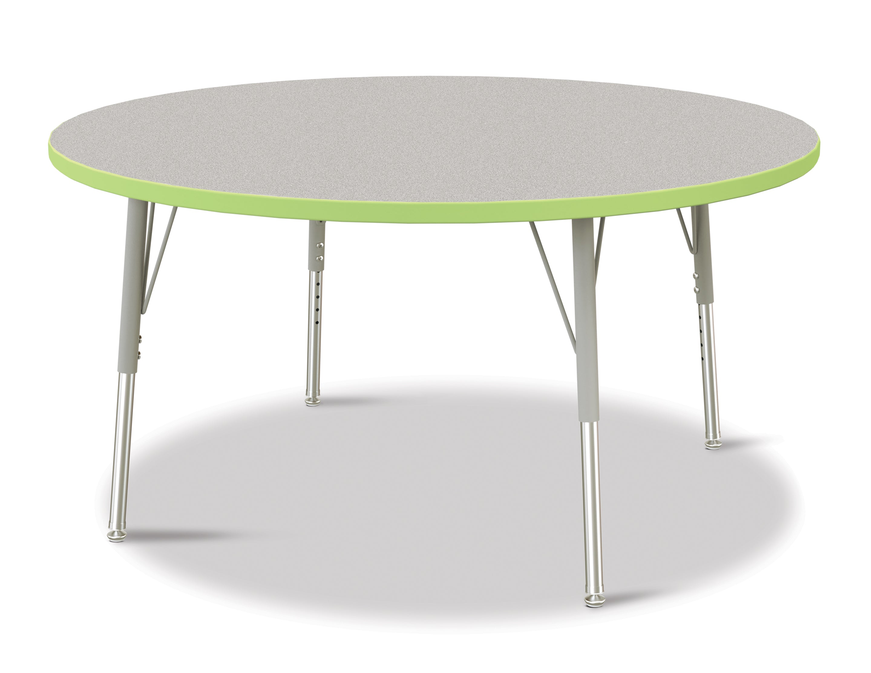 These round tables are excellent for allowing children to interact with each other during projects. Accommodates up to 8 chairs. The legs feature glides that reduce noise, prevent snags, and resist rust. Freckled gray laminate tabletop with green TRUEdge and gray legs.KYDZSafe edges. KYDZStrong construction. TRUEdge. Choose from multiple tabletop and TRUEdge color combinations. Thermally Fused Laminate tabletops 1-1/8â thick. Quick mount legs with minimal assembly. Legs adjust in one-inch increments with the extra-safe dual-screw leg adjustability system. Helpful Hint: Most children require elementary size tables tiny tables typically fit children just 1 to 2 years old. Adjusts from 15" to 24" high. See cleaning recommendations at www.jonti-craft.com/cleaning.Product Height (inches):15-24Product Width (inches):48Product Depth (inches: 48