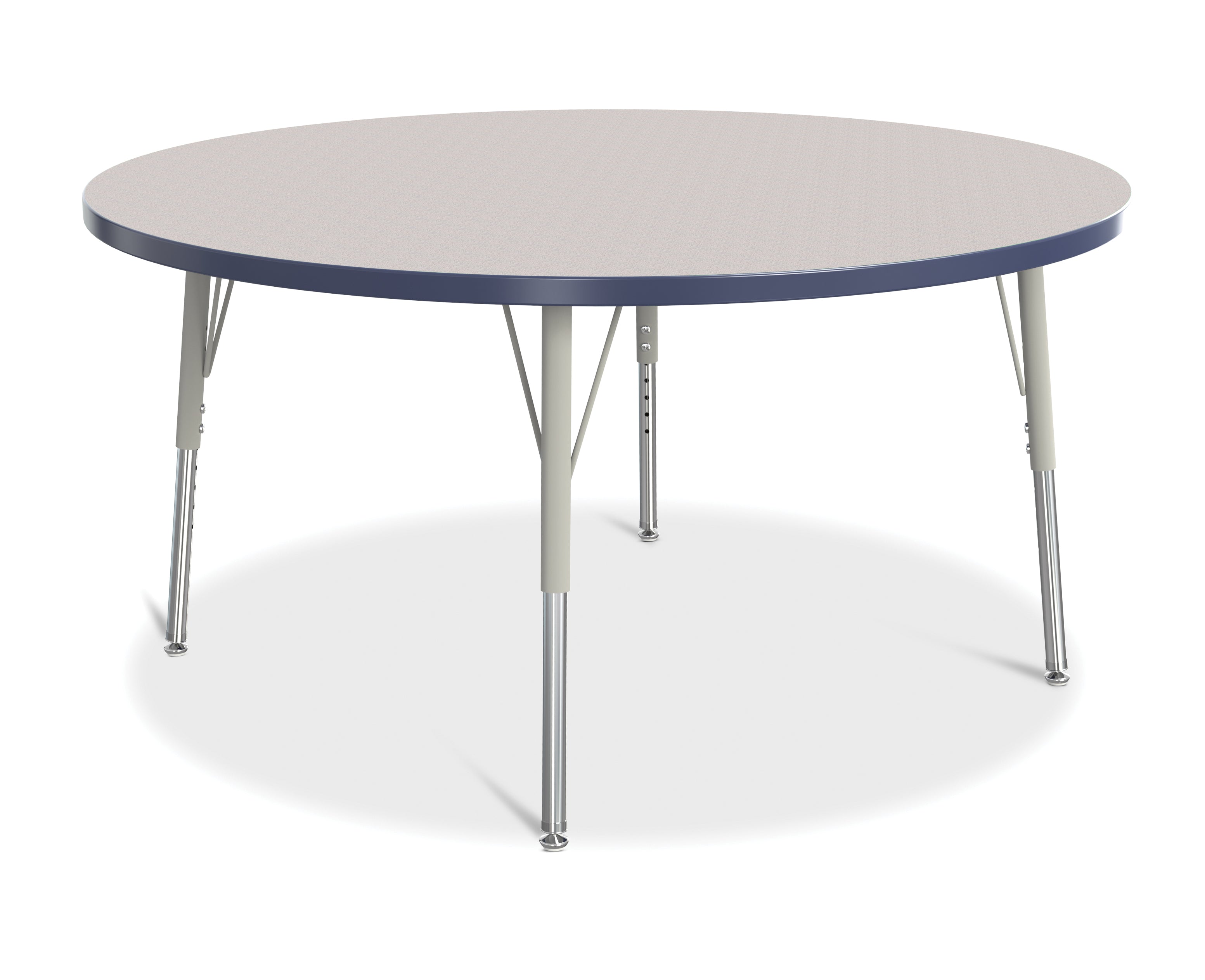 These round tables are excellent for allowing children to interact with each other during projects. Accommodates up to 8 chairs. The legs feature glides that reduce noise, prevent snags, and resist rust. Freckled gray laminate tabletop with navy TRUEdge and gray legs.KYDZSafe edges. KYDZStrong construction. TRUEdge. Choose from multiple tabletop and TRUEdge color combinations. Thermally Fused Laminate tabletops 1-1/8â thick. Quick mount legs with minimal assembly. Legs adjust in one-inch increments with the extra-safe dual-screw leg adjustability system. Helpful Hint: Most children require elementary size tables tiny tables typically fit children just 1 to 2 years old. Adjusts from 15" to 24" high. See cleaning recommendations at www.jonti-craft.com/cleaning.Product Height (inches):15-24Product Width (inches):48Product Depth (inches: 48