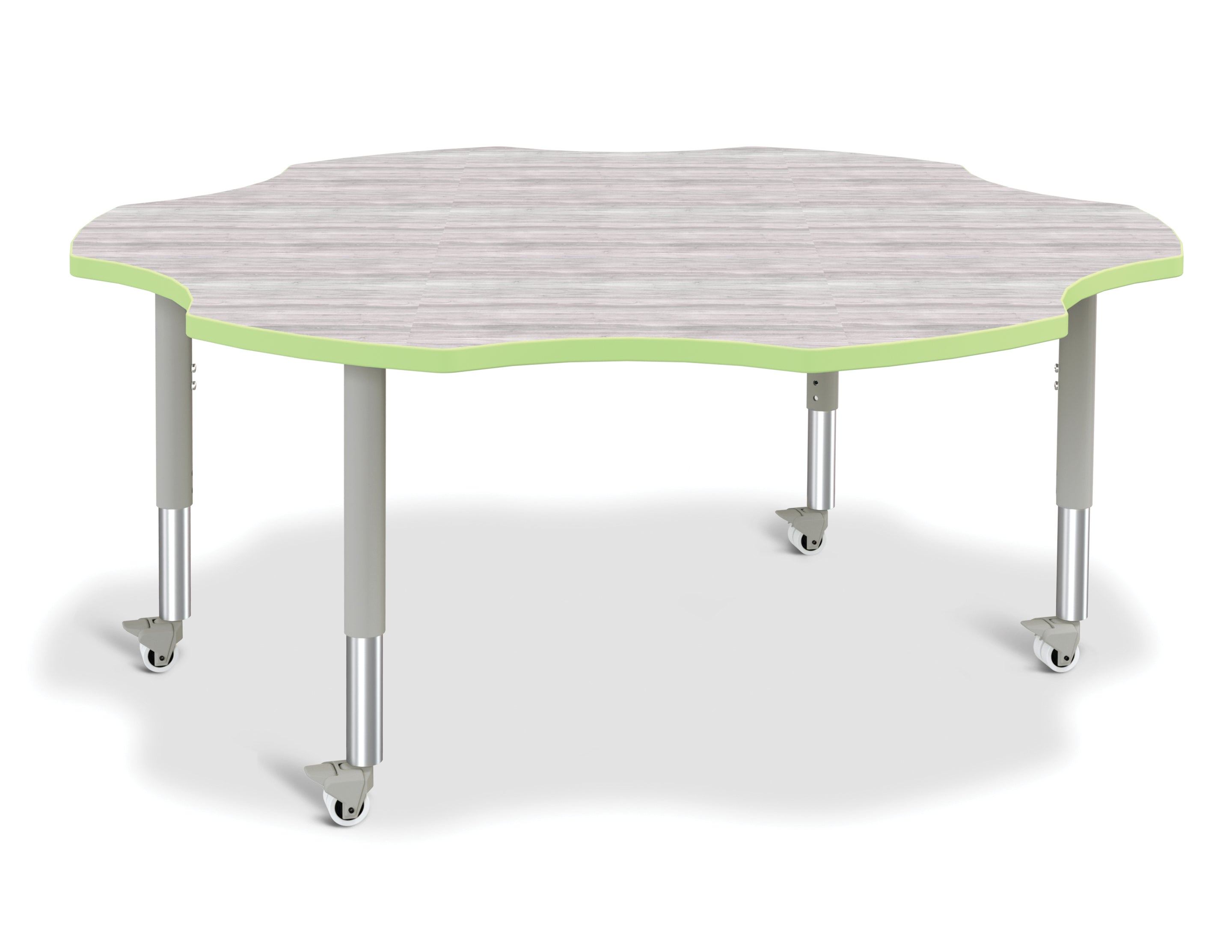 Perfect seating area for any early learning space. Accommodates up to 6 chairs. The legs adjust from 20â to 31â high, are 2â thick, and feature heavy-duty casters. Driftwood Gray tabletop with Key Lime TRUEdge, gray legs, and gray casters.KYDZSafe edges. KYDZStrong construction. TRUEdge. Choose from multiple tabletop and TRUEdge color combinations. Thermally Fused Laminate tabletops 1-1/8â thick. Quick mount legs with minimal assembly. Legs adjust in one-inch increments with the extra-safe dual-screw leg adjustability system. Helpful Hint: Most children require elementary size tables tiny tables typically fit children just 1 to 2 years old. Adjusts from 18â to 29â high (or 20â to 31â with casters). See cleaning recommendations at www.jonti-craft.com/cleaning.Product Height (inches):20-31Product Width (inches):60Product Depth (inches: 57.5