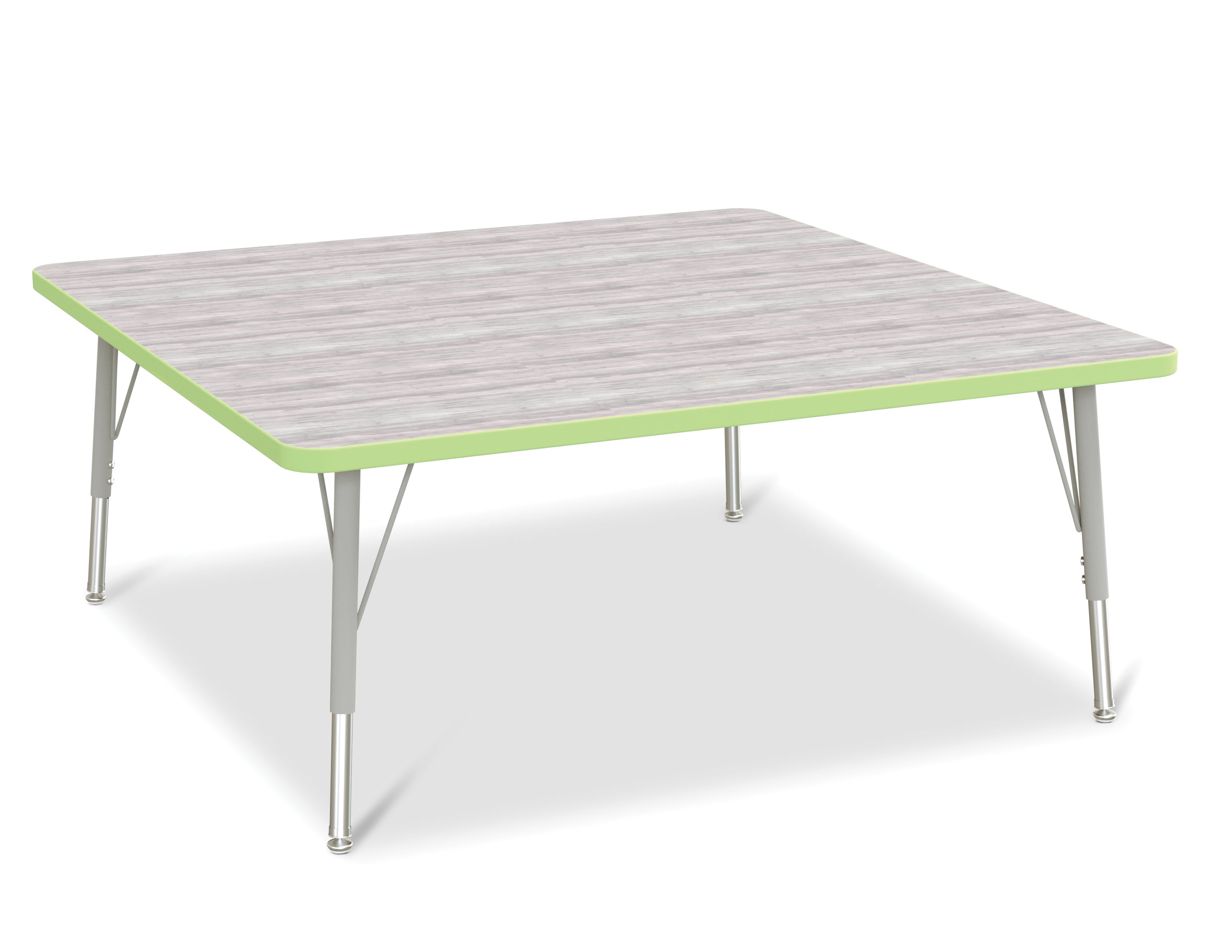 Keep it simple with a square table. Accommodates up to 8 chairs. The legs feature glides that reduce noise, prevent snags, and resist rust. Driftwood Gray tabletop with Key Lime TRUEdge and Gray legs.KYDZSafe edges. KYDZStrong construction. TRUEdge. Choose from multiple tabletop and TRUEdge color combinations. Thermally Fused Laminate tabletops 1-1/8â thick. Quick mount legs with minimal assembly. Legs adjust in one-inch increments with the extra-safe dual-screw leg adjustability system. Helpful Hint: Most children require elementary size tables tiny tables typically fit children just 1 to 2 years old. Adjusts from 15" to 24" high. See cleaning recommendations at www.jonti-craft.com/cleaning.Product Height (inches):15-24Product Width (inches):48Product Depth (inches: 48