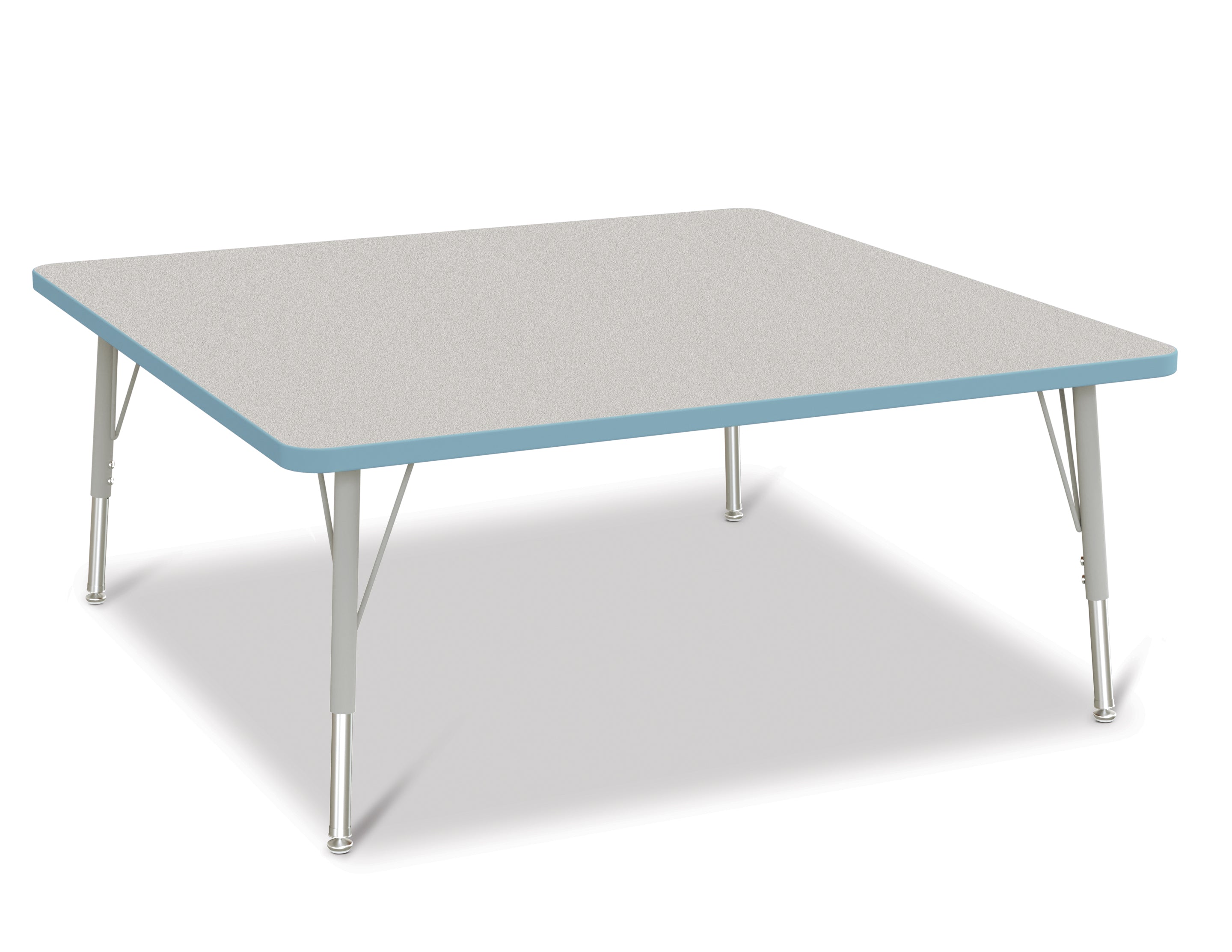 Keep it simple with a square table. Accommodates up to 8 chairs. The legs feature glides that reduce noise, prevent snags, and resist rust. Freckled gray laminate tabletop with green TRUEdge and gray legs.KYDZSafe edges. KYDZStrong construction. TRUEdge. Choose from multiple tabletop and TRUEdge color combinations. Thermally Fused Laminate tabletops 1-1/8â thick. Quick mount legs with minimal assembly. Legs adjust in one-inch increments with the extra-safe dual-screw leg adjustability system. Helpful Hint: Most children require elementary size tables tiny tables typically fit children just 1 to 2 years old. Adjusts from 15" to 24" high. See cleaning recommendations at www.jonti-craft.com/cleaning.Product Height (inches):15-24Product Width (inches):48Product Depth (inches: 48