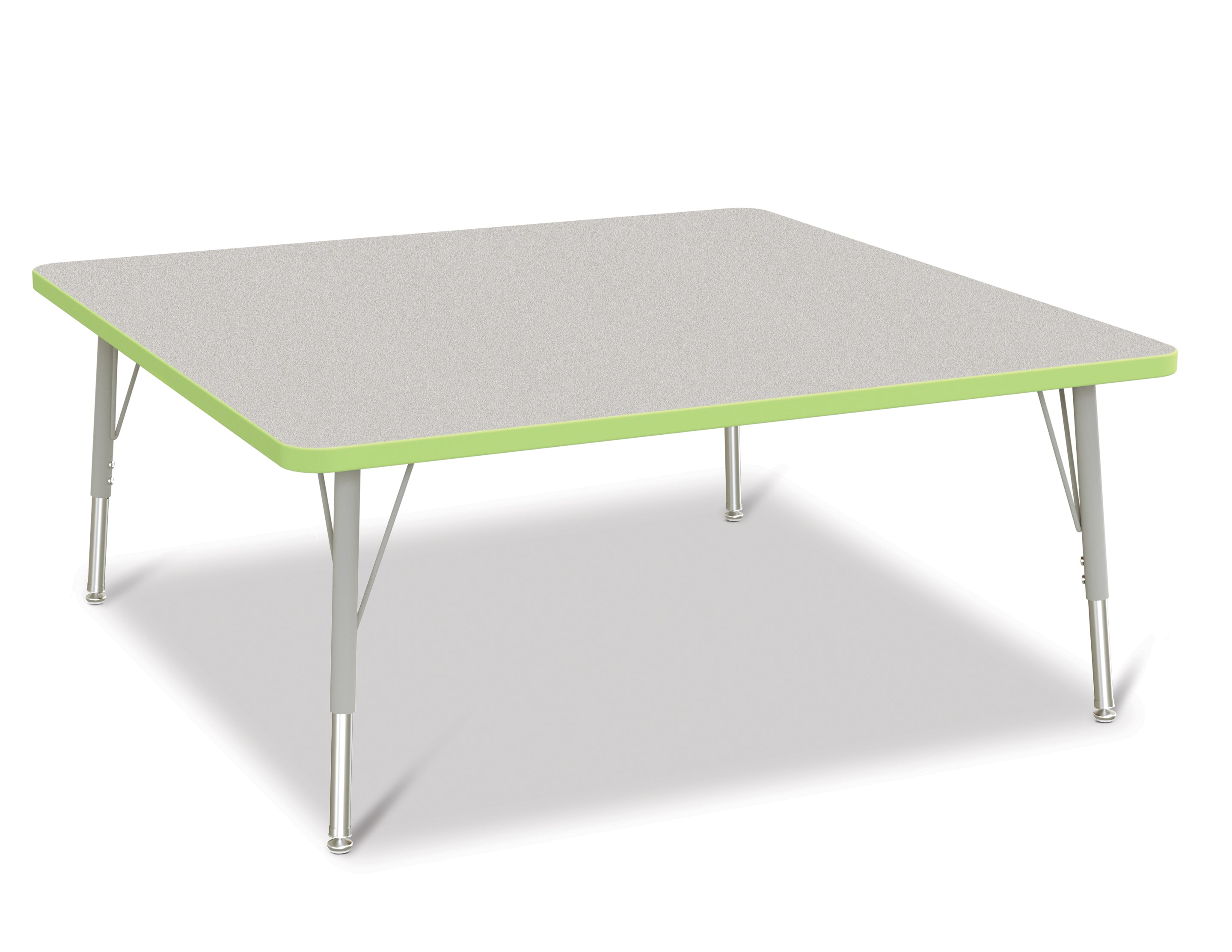 Keep it simple with a square table. Accommodates up to 8 chairs. The legs feature glides that reduce noise, prevent snags, and resist rust. Freckled gray laminate tabletop with green TRUEdge and gray legs.KYDZSafe edges. KYDZStrong construction. TRUEdge. Choose from multiple tabletop and TRUEdge color combinations. Thermally Fused Laminate tabletops 1-1/8â thick. Quick mount legs with minimal assembly. Legs adjust in one-inch increments with the extra-safe dual-screw leg adjustability system. Helpful Hint: Most children require elementary size tables tiny tables typically fit children just 1 to 2 years old. Adjusts from 15" to 24" high. See cleaning recommendations at www.jonti-craft.com/cleaning.Product Height (inches):15-24Product Width (inches):48Product Depth (inches: 48