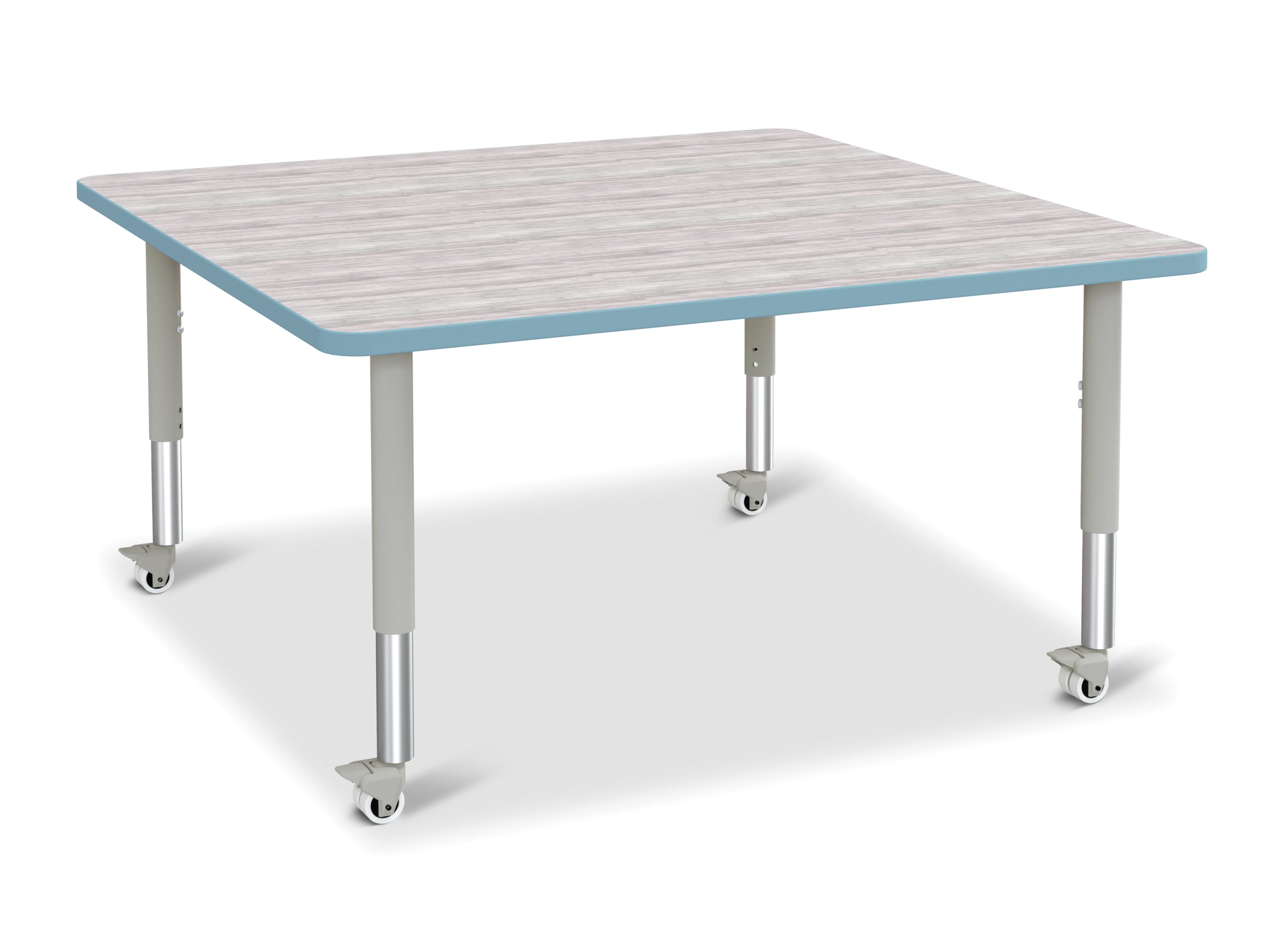 Keep it simple with a square table. Accommodates up to 8 chairs. The legs adjust from 20â to 31â high, are 2â thick, and feature heavy-duty casters. Driftwood Gray tabletop with Coastal Blue TRUEdge, gray legs, and gray casters.KYDZSafe edges. KYDZStrong construction. TRUEdge. Choose from multiple tabletop and TRUEdge color combinations. Thermally Fused Laminate tabletops 1-1/8â thick. Quick mount legs with minimal assembly. Legs adjust in one-inch increments with the extra-safe dual-screw leg adjustability system. Helpful Hint: Most children require elementary size tables tiny tables typically fit children just 1 to 2 years old. Adjusts from 18â to 29â high (or 20â to 31â with casters). See cleaning recommendations at www.jonti-craft.com/cleaning.Product Height (inches):20-31Product Width (inches):48Product Depth (inches: 48