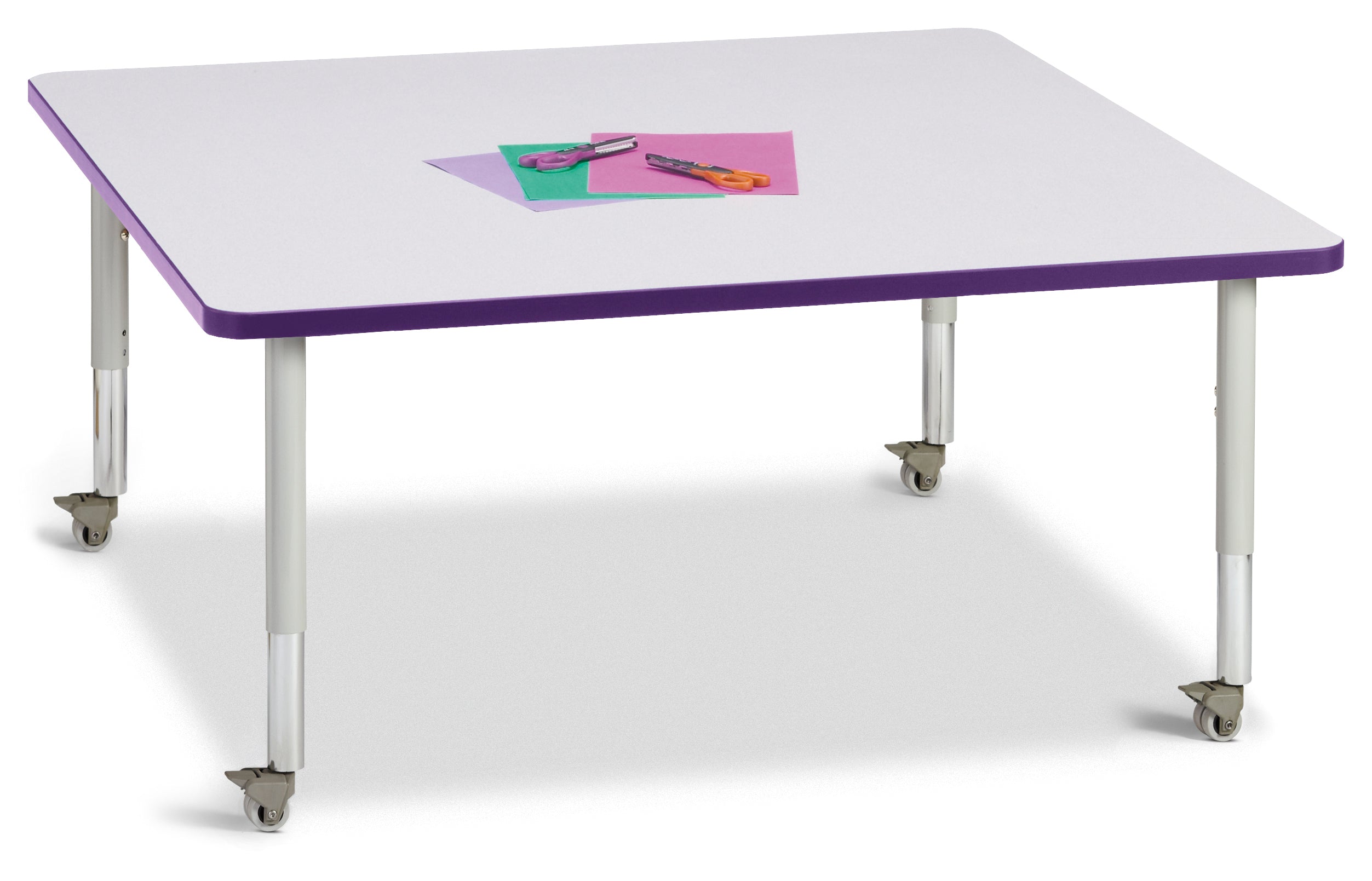 Keep it simple with a square table. Accommodates up to 8 chairs. The legs adjust from 20â to 31â high, are 2â thick, and feature heavy-duty casters. Freckled gray laminate tabletop with purple TRUEdge, gray legs, and gray casters.KYDZSafe edges. KYDZStrong construction. TRUEdge. Choose from multiple tabletop and TRUEdge color combinations. Thermally Fused Laminate tabletops 1-1/8â thick. Quick mount legs with minimal assembly. Legs adjust in one-inch increments with the extra-safe dual-screw leg adjustability system. Helpful Hint: Most children require elementary size tables tiny tables typically fit children just 1 to 2 years old. See cleaning recommendations at www.jonti-craft.com/cleaning.Product Height (inches):20-31Product Width (inches):48Product Depth (inches: 48