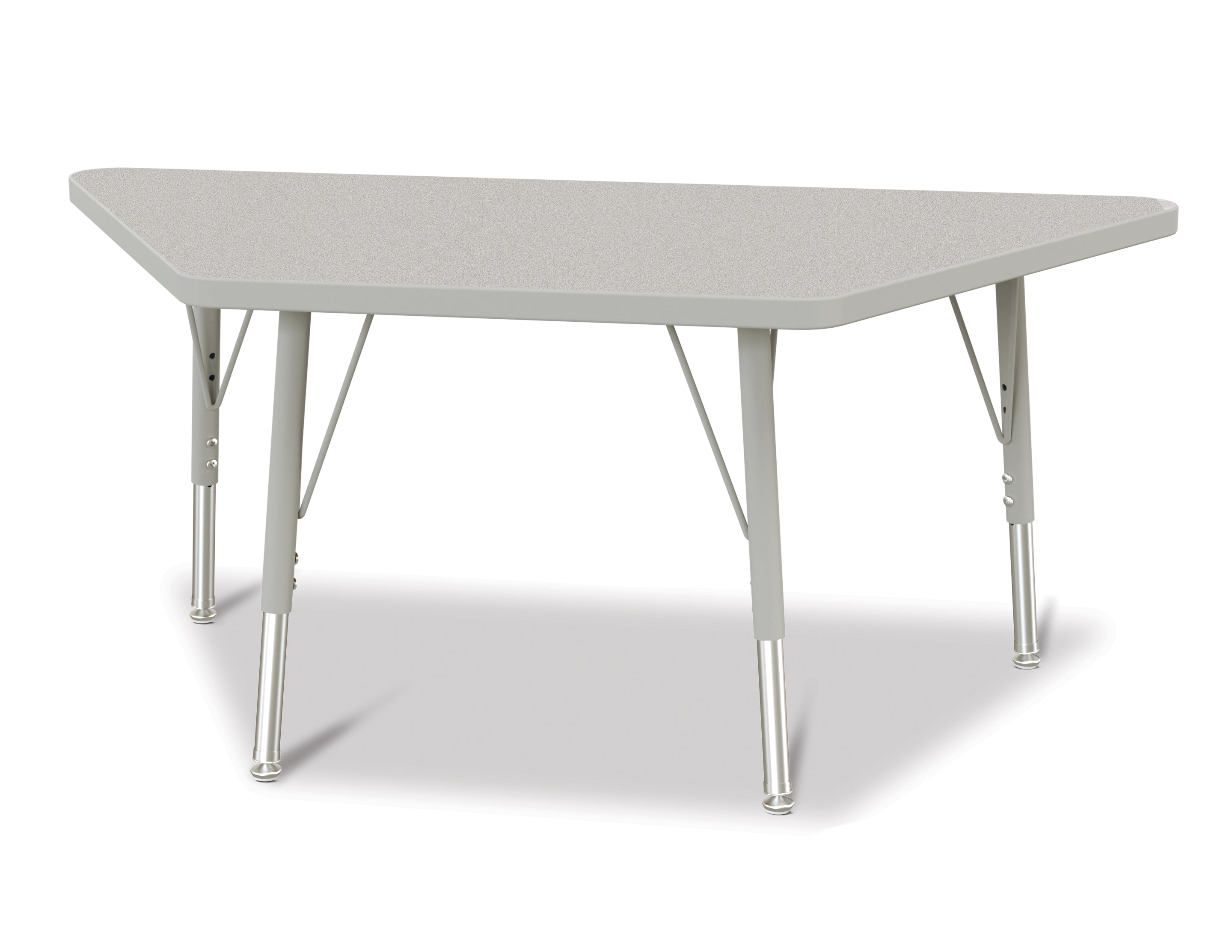 Great for students of any age, multiple trapezoid tables can be arranged in many configurations to accommodate any space. Accommodates up to 5 chairs. The legs feature glides that reduce noise, prevent snags, and resist rust. Freckled gray laminate tabletop with gray TRUEdge and gray legs.KYDZSafe edges. KYDZStrong construction. TRUEdge. Choose from multiple tabletop and TRUEdge color combinations. Thermally Fused Laminate tabletops 1-1/8â thick. Quick mount legs with minimal assembly. Legs adjust in one-inch increments with the extra-safe dual-screw leg adjustability system. Helpful Hint: Most children require elementary size tables tiny tables typically fit children just 1 to 2 years old. Adjusts from 15" to 24" high. See cleaning recommendations at www.jonti-craft.com/cleaning.Product Height (inches):15-24Product Width (inches):48Product Depth (inches: 24