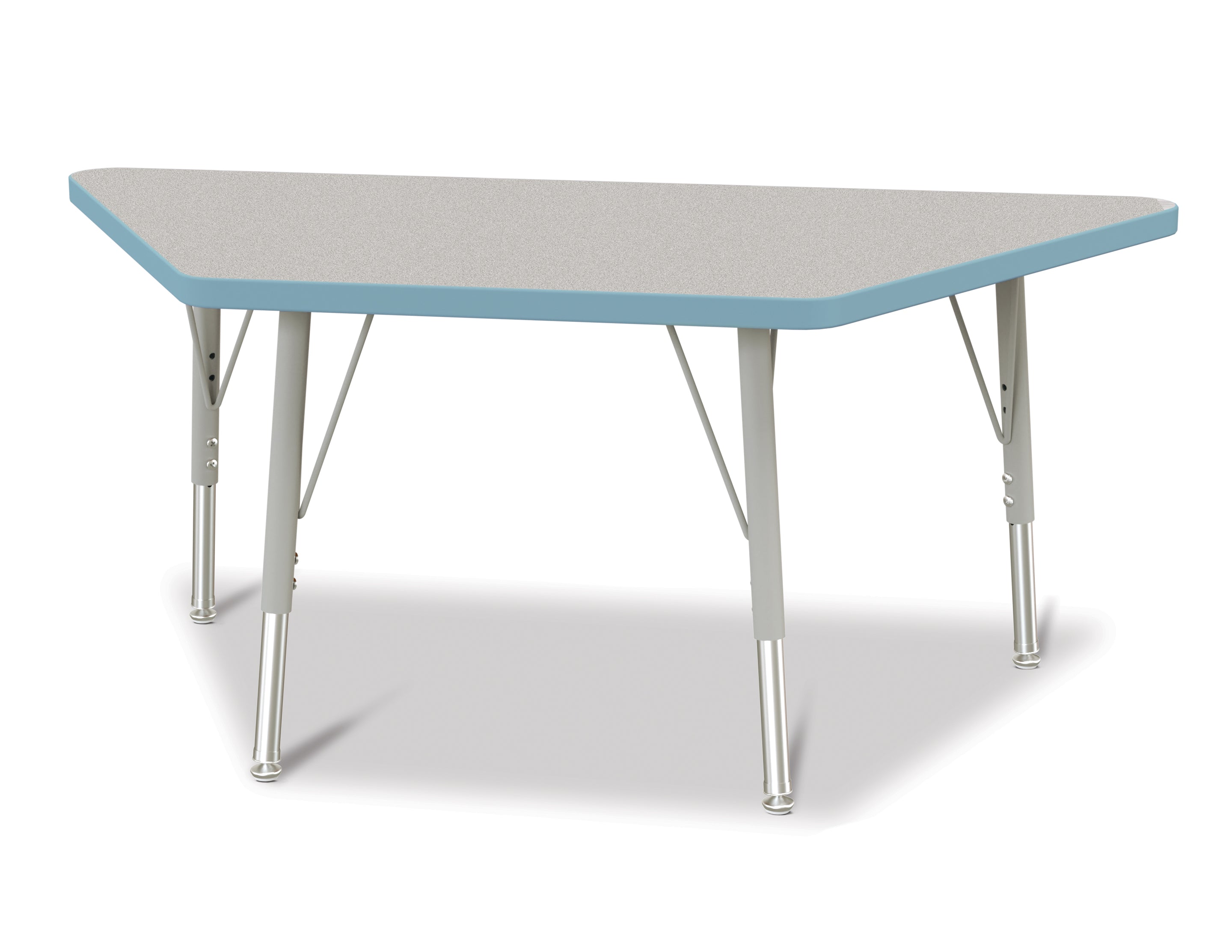 Great for students of any age, multiple trapezoid tables can be arranged in many configurations to accommodate any space. Accommodates up to 5 chairs. The legs feature glides that reduce noise, prevent snags, and resist rust. Freckled gray laminate tabletop with coastal blue TRUEdge and gray legs.KYDZSafe edges. KYDZStrong construction. TRUEdge. Choose from multiple tabletop and TRUEdge color combinations. Thermally Fused Laminate tabletops 1-1/8â thick. Quick mount legs with minimal assembly. Legs adjust in one-inch increments with the extra-safe dual-screw leg adjustability system. Helpful Hint: Most children require elementary size tables tiny tables typically fit children just 1 to 2 years old. Adjusts from 15" to 24" high. See cleaning recommendations at www.jonti-craft.com/cleaning.Product Height (inches):15-24Product Width (inches):48Product Depth (inches: 24