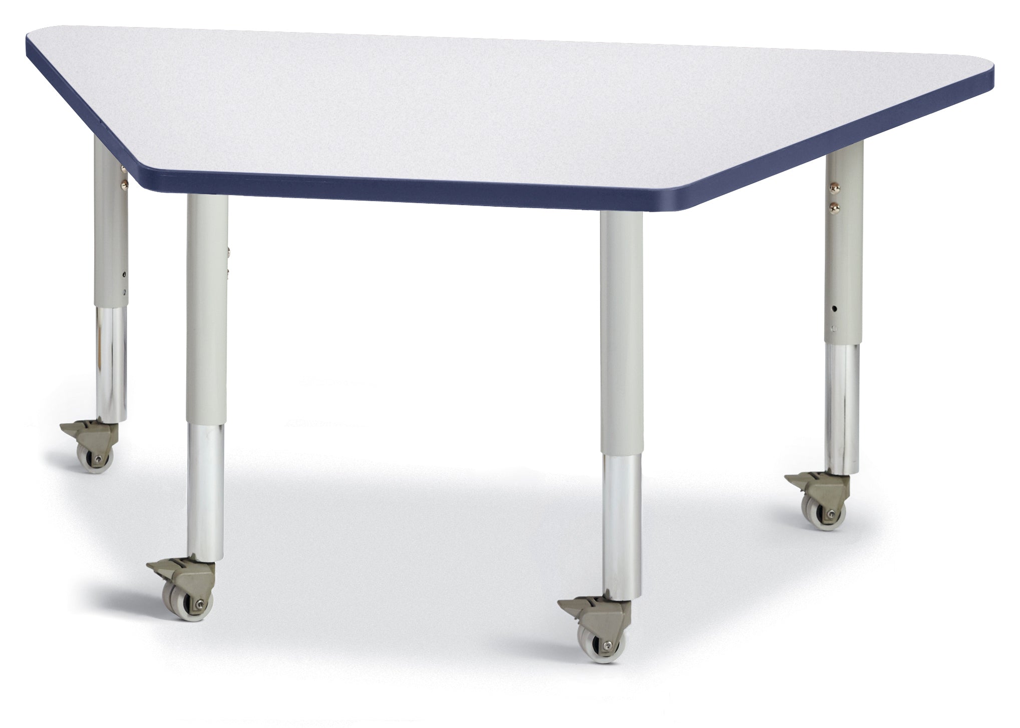 Great for students of any age, multiple trapezoid tables can be arranged in many configurations to accommodate any space. Accommodates up to 5 chairs. The legs adjust from 20â to 31â high, are 2â thick, and feature heavy-duty casters. Freckled gray laminate tabletop with navy TRUEdge, gray legs, and gray casters.KYDZSafe edges. KYDZStrong construction. TRUEdge. Choose from multiple tabletop and TRUEdge color combinations. Thermally Fused Laminate tabletops 1-1/8â thick. Quick mount legs with minimal assembly. Legs adjust in one-inch increments with the extra-safe dual-screw leg adjustability system. Helpful Hint: Most children require elementary size tables tiny tables typically fit children just 1 to 2 years old. See cleaning recommendations at www.jonti-craft.com/cleaning.Product Height (inches):20-31Product Width (inches):48Product Depth (inches: 24