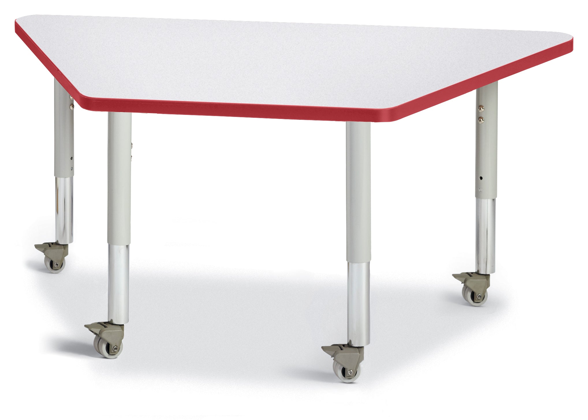 Great for students of any age, multiple trapezoid tables can be arranged in many configurations to accommodate any space. Accommodates up to 5 chairs. The legs adjust from 20â to 31â high, are 2â thick, and feature heavy-duty casters. Freckled gray laminate tabletop with red TRUEdge, gray legs, and gray casters.KYDZSafe edges. KYDZStrong construction. TRUEdge. Choose from multiple tabletop and TRUEdge color combinations. Thermally Fused Laminate tabletops 1-1/8â thick. Quick mount legs with minimal assembly. Legs adjust in one-inch increments with the extra-safe dual-screw leg adjustability system. Helpful Hint: Most children require elementary size tables tiny tables typically fit children just 1 to 2 years old. See cleaning recommendations at www.jonti-craft.com/cleaning.Product Height (inches):20-31Product Width (inches):48Product Depth (inches: 24