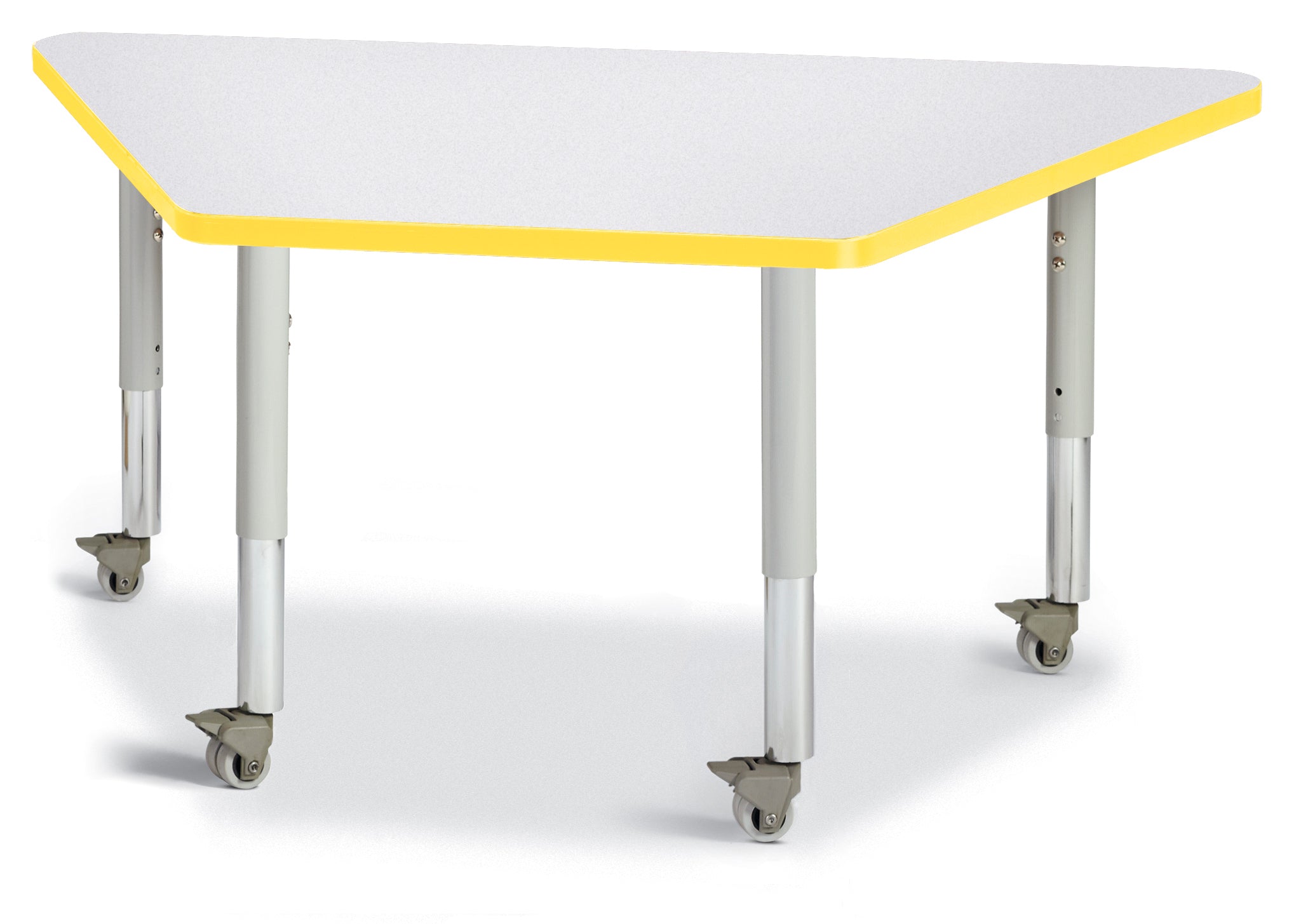 Great for students of any age, multiple trapezoid tables can be arranged in many configurations to accommodate any space. Accommodates up to 5 chairs. The legs adjust from 20â to 31â high, are 2â thick, and feature heavy-duty casters. Freckled gray laminate tabletop with yellow TRUEdge, gray legs, and gray casters.KYDZSafe edges. KYDZStrong construction. TRUEdge. Choose from multiple tabletop and TRUEdge color combinations. Thermally Fused Laminate tabletops 1-1/8â thick. Quick mount legs with minimal assembly. Legs adjust in one-inch increments with the extra-safe dual-screw leg adjustability system. Helpful Hint: Most children require elementary size tables tiny tables typically fit children just 1 to 2 years old. See cleaning recommendations at www.jonti-craft.com/cleaning.Product Height (inches):20-31Product Width (inches):48Product Depth (inches: 24