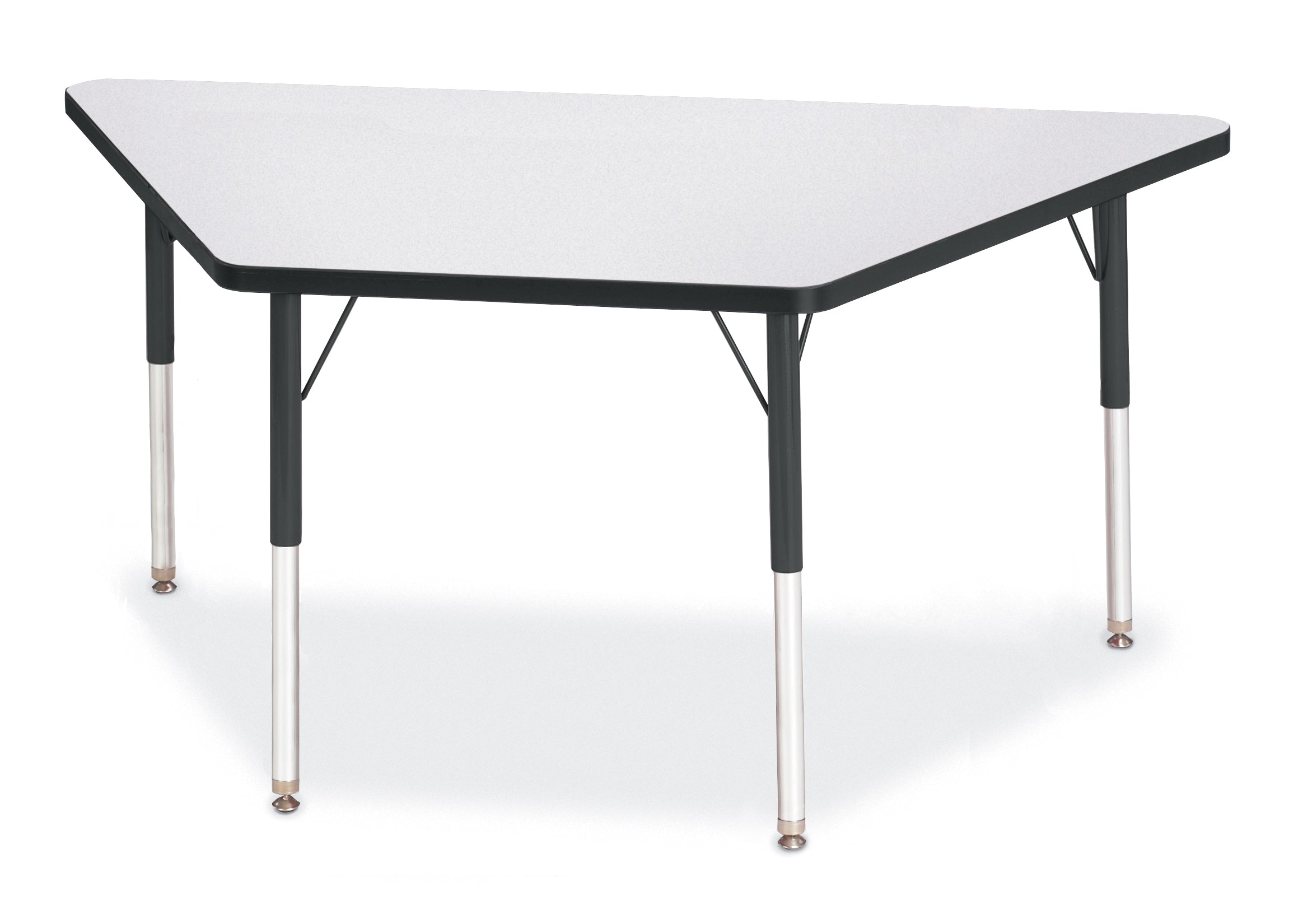 Great for students of any age, multiple trapezoid tables can be arranged in many configurations to accommodate any space. Accommodates up to 5 chairs. The legs feature glides that reduce noise, prevent snags, and resist rust. Freckled gray laminate tabletop with black TRUEdge and black legs.KYDZSafe edges. KYDZStrong construction. TRUEdge. Choose from multiple tabletop and TRUEdge color combinations. Thermally Fused Laminate tabletops 1-1/8â thick. Quick mount legs with minimal assembly. Legs adjust in one-inch increments with the extra-safe dual-screw leg adjustability system. Helpful Hint: Most children require elementary size tables tiny tables typically fit children just 1 to 2 years old. Adjusts from 24" to 31" high. See cleaning recommendations at www.jonti-craft.com/cleaning.Product Height (inches):24-31Product Width (inches):60Product Depth (inches: 30