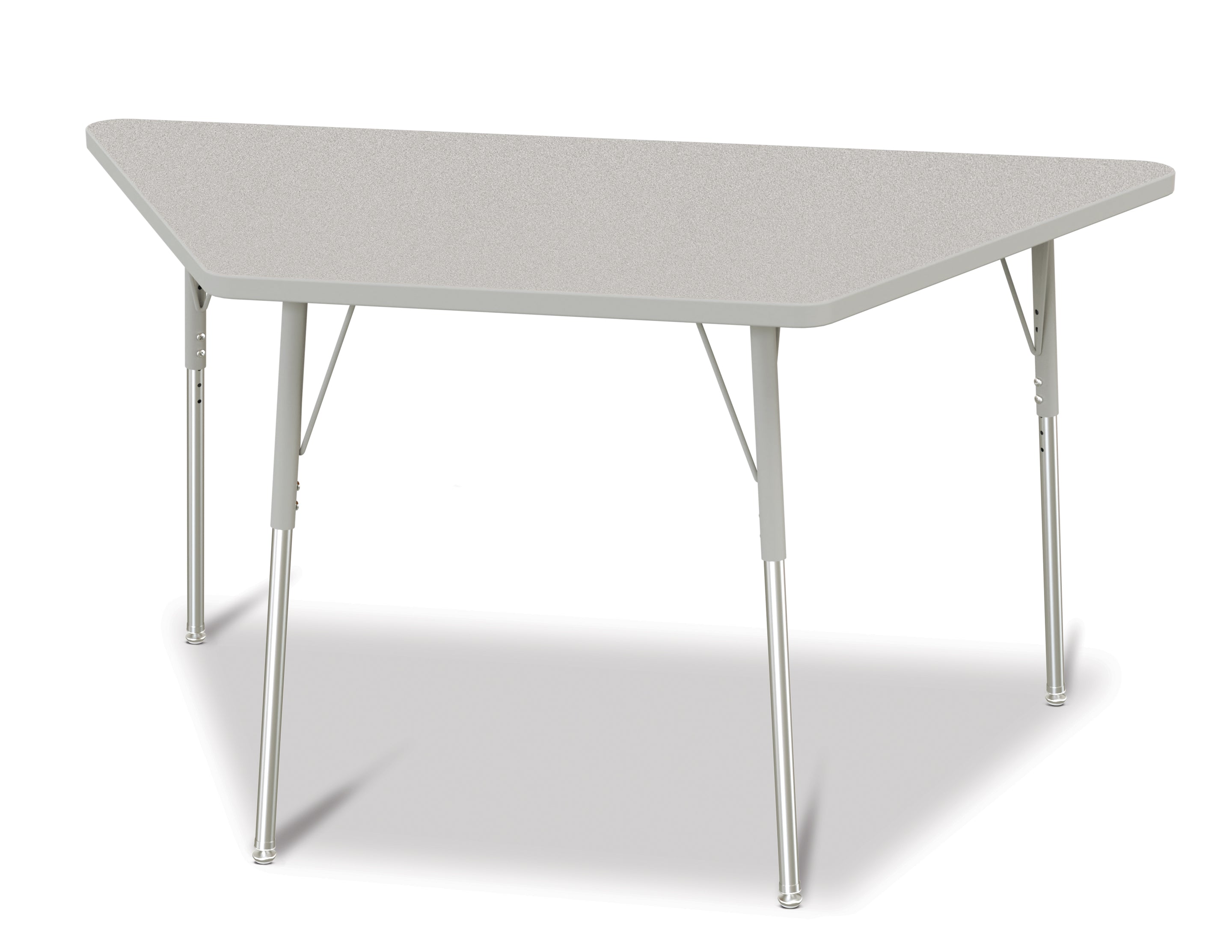 Great for students of any age, multiple trapezoid tables can be arranged in many configurations to accommodate any space. Accommodates up to 5 chairs. The legs feature glides that reduce noise, prevent snags, and resist rust. Freckled gray laminate tabletop with gray TRUEdge and gray legs.KYDZSafe edges. KYDZStrong construction. TRUEdge. Choose from multiple tabletop and TRUEdge color combinations. Thermally Fused Laminate tabletops 1-1/8â thick. Quick mount legs with minimal assembly. Legs adjust in one-inch increments with the extra-safe dual-screw leg adjustability system. Helpful Hint: Most children require elementary size tables tiny tables typically fit children just 1 to 2 years old. Adjusts from 24" to 31" high. See cleaning recommendations at www.jonti-craft.com/cleaning.Product Height (inches):24-31Product Width (inches):60Product Depth (inches: 30