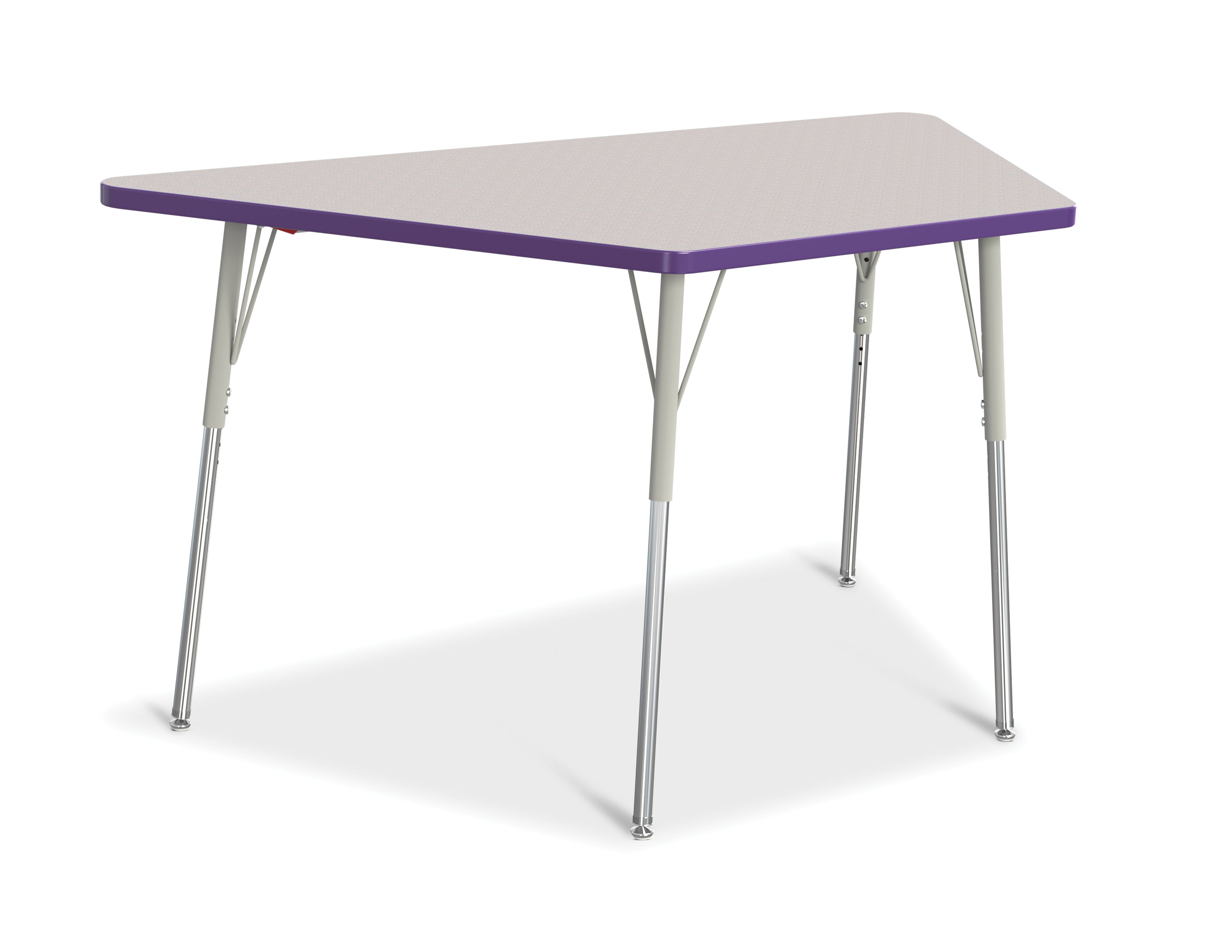 Great for students of any age, multiple trapezoid tables can be arranged in many configurations to accommodate any space. Accommodates up to 5 chairs. The legs feature glides that reduce noise, prevent snags, and resist rust. Freckled gray laminate tabletop with purple TRUEdge and gray legs.KYDZSafe edges. KYDZStrong construction. TRUEdge. Choose from multiple tabletop and TRUEdge color combinations. Thermally Fused Laminate tabletops 1-1/8â thick. Quick mount legs with minimal assembly. Legs adjust in one-inch increments with the extra-safe dual-screw leg adjustability system. Helpful Hint: Most children require elementary size tables tiny tables typically fit children just 1 to 2 years old. Adjusts from 24" to 31" high. See cleaning recommendations at www.jonti-craft.com/cleaning.Product Height (inches):24-31Product Width (inches):60Product Depth (inches: 30