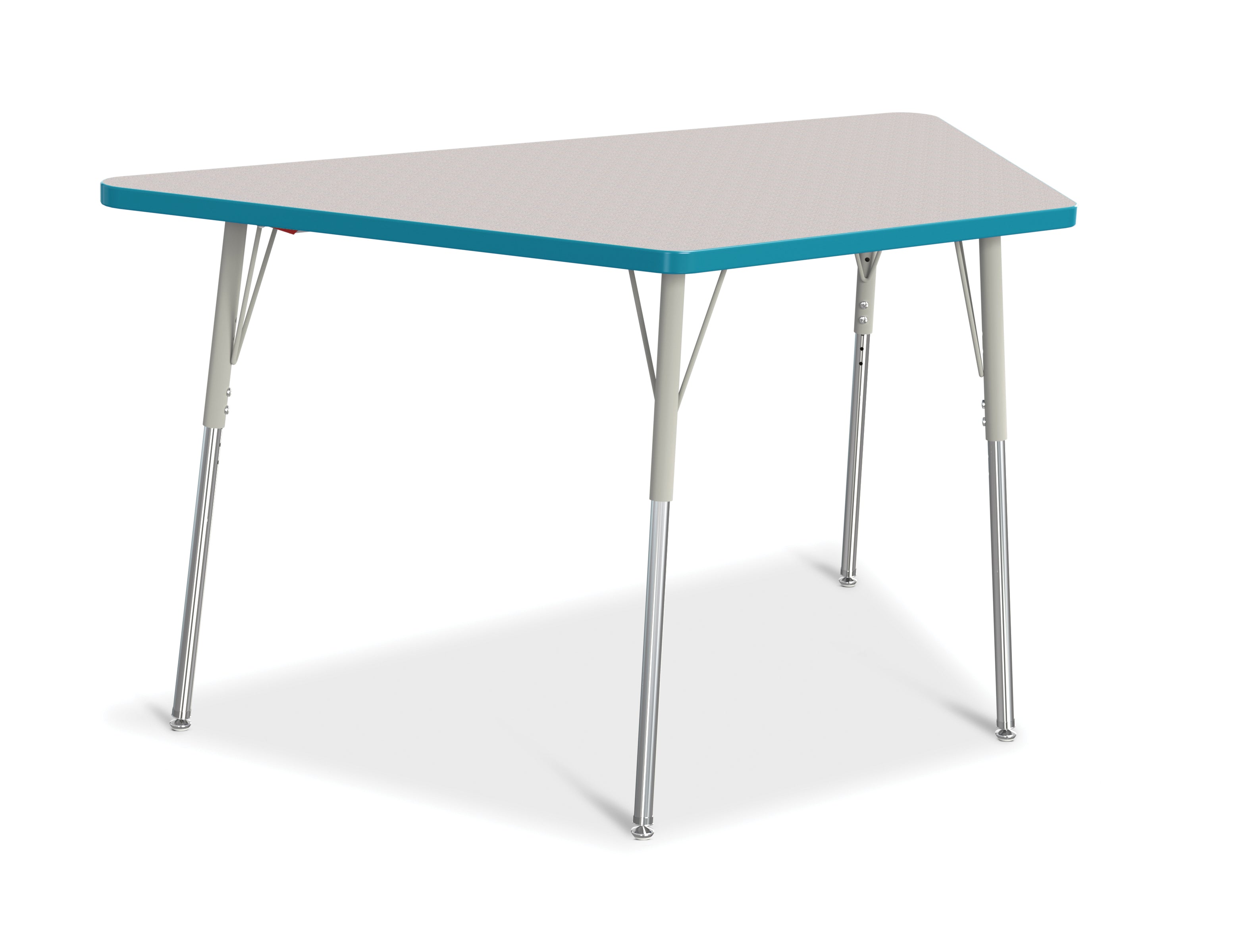 Great for students of any age, multiple trapezoid tables can be arranged in many configurations to accommodate any space. Accommodates up to 5 chairs. The legs feature glides that reduce noise, prevent snags, and resist rust. Freckled gray laminate tabletop with teal TRUEdge and gray legs.KYDZSafe edges. KYDZStrong construction. TRUEdge. Choose from multiple tabletop and TRUEdge color combinations. Thermally Fused Laminate tabletops 1-1/8â thick. Quick mount legs with minimal assembly. Legs adjust in one-inch increments with the extra-safe dual-screw leg adjustability system. Helpful Hint: Most children require elementary size tables tiny tables typically fit children just 1 to 2 years old. Adjusts from 24" to 31" high. See cleaning recommendations at www.jonti-craft.com/cleaning.Product Height (inches):24-31Product Width (inches):60Product Depth (inches: 30