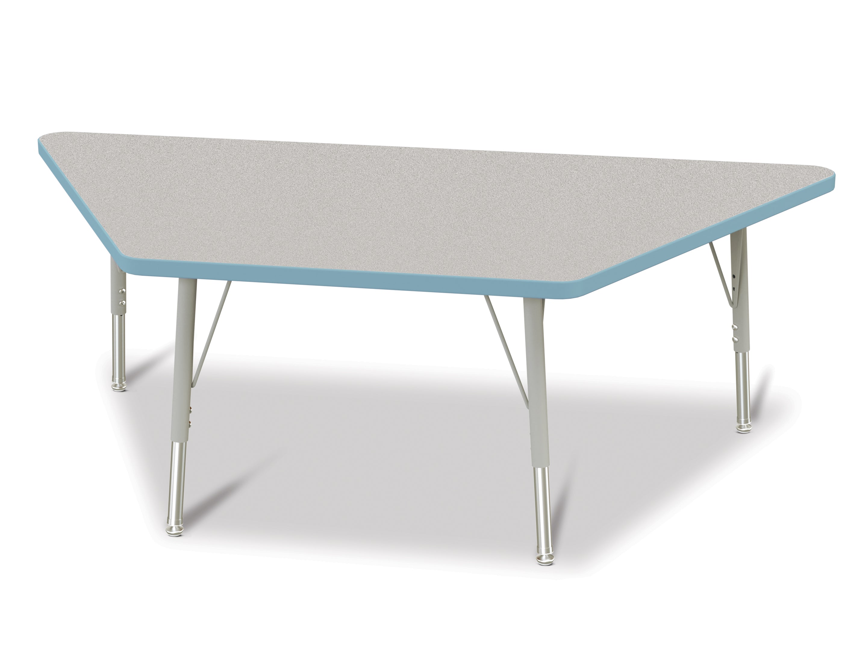 Great for students of any age, multiple trapezoid tables can be arranged in many configurations to accommodate any space. Accommodates up to 5 chairs. The legs feature glides that reduce noise, prevent snags, and resist rust. Freckled gray laminate tabletop with coastal blue TRUEdge and gray legs.KYDZSafe edges. KYDZStrong construction. TRUEdge. Choose from multiple tabletop and TRUEdge color combinations. Thermally Fused Laminate tabletops 1-1/8â thick. Quick mount legs with minimal assembly. Legs adjust in one-inch increments with the extra-safe dual-screw leg adjustability system. Helpful Hint: Most children require elementary size tables tiny tables typically fit children just 1 to 2 years old. Adjusts from 15" to 24" high. See cleaning recommendations at www.jonti-craft.com/cleaning.Product Height (inches):15-24Product Width (inches):60Product Depth (inches: 30