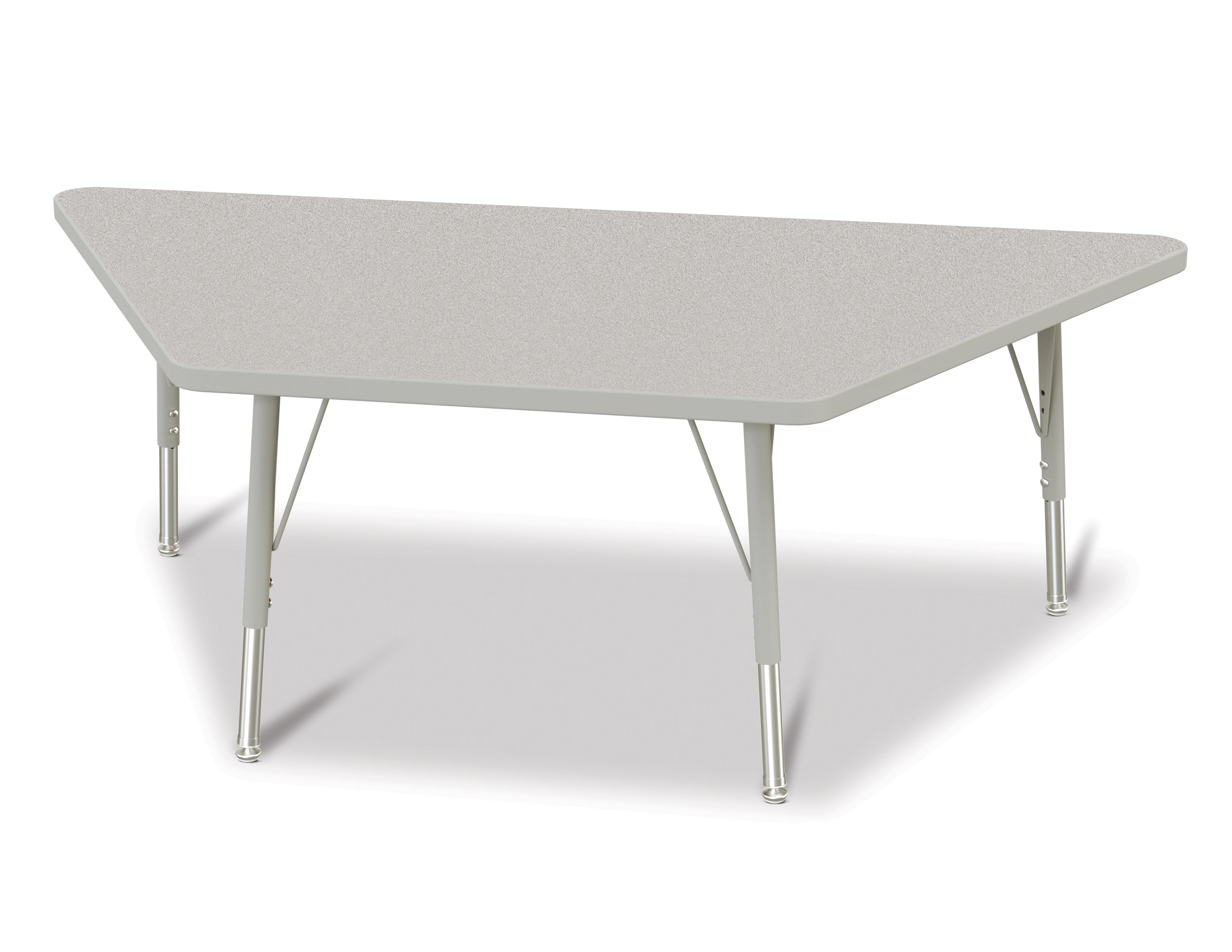 Great for students of any age, multiple trapezoid tables can be arranged in many configurations to accommodate any space. Accommodates up to 5 chairs. The legs feature glides that reduce noise, prevent snags, and resist rust. Freckled gray laminate tabletop with gray TRUEdge and gray legs.KYDZSafe edges. KYDZStrong construction. TRUEdge. Choose from multiple tabletop and TRUEdge color combinations. Thermally Fused Laminate tabletops 1-1/8â thick. Quick mount legs with minimal assembly. Legs adjust in one-inch increments with the extra-safe dual-screw leg adjustability system. Helpful Hint: Most children require elementary size tables tiny tables typically fit children just 1 to 2 years old. Adjusts from 15" to 24" high. See cleaning recommendations at www.jonti-craft.com/cleaning.Product Height (inches):15-24Product Width (inches):60Product Depth (inches: 30