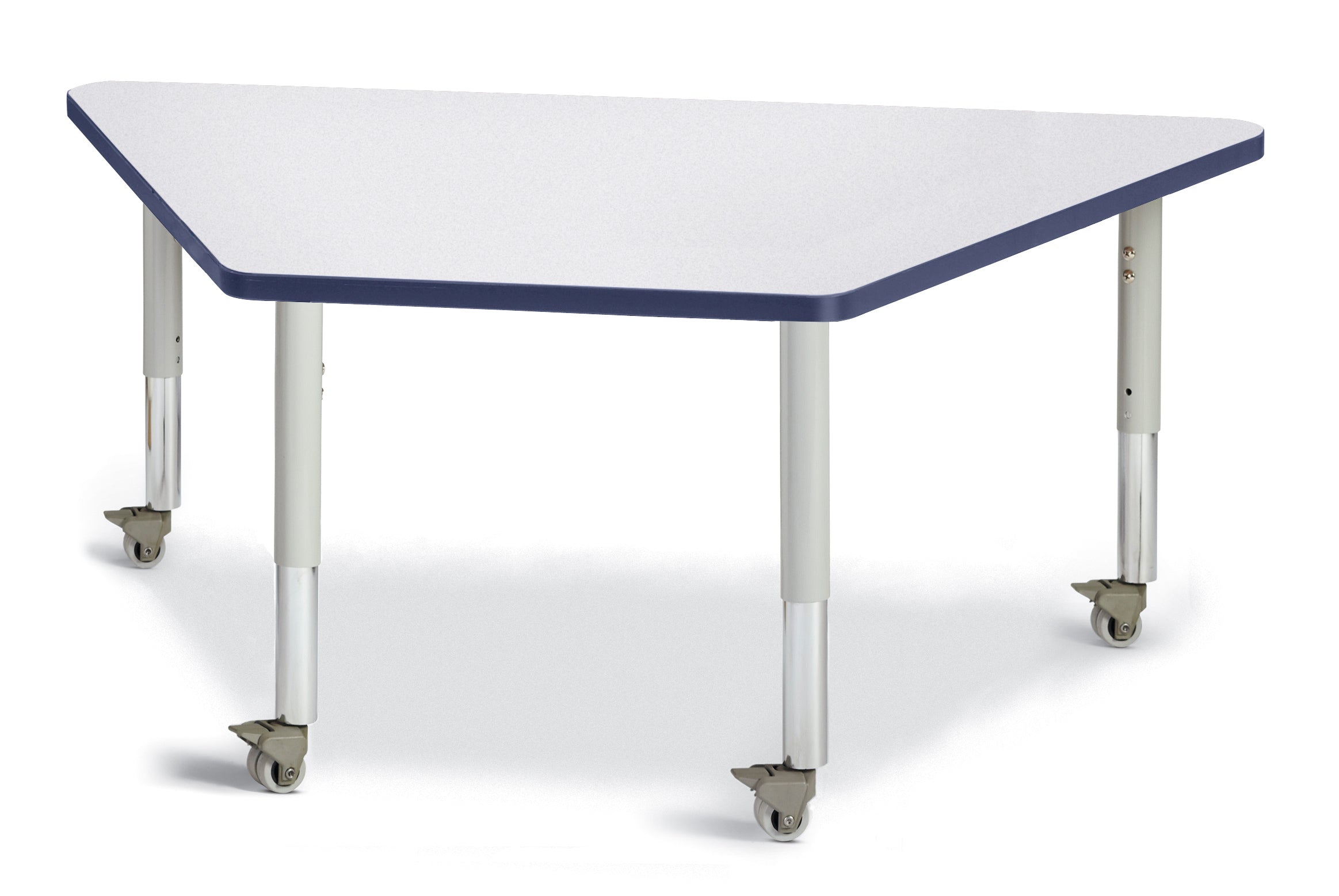Great for students of any age, multiple trapezoid tables can be arranged in many configurations to accommodate any space. Accommodates up to 5 chairs. The legs adjust from 20â to 31â high, are 2â thick, and feature heavy-duty casters. Freckled gray laminate tabletop with navy TRUEdge, gray legs, and gray casters.KYDZSafe edges. KYDZStrong construction. TRUEdge. Choose from multiple tabletop and TRUEdge color combinations. Thermally Fused Laminate tabletops 1-1/8â thick. Quick mount legs with minimal assembly. Legs adjust in one-inch increments with the extra-safe dual-screw leg adjustability system. Helpful Hint: Most children require elementary size tables tiny tables typically fit children just 1 to 2 years old. See cleaning recommendations at www.jonti-craft.com/cleaning.Product Height (inches):20-31Product Width (inches):60Product Depth (inches: 30
