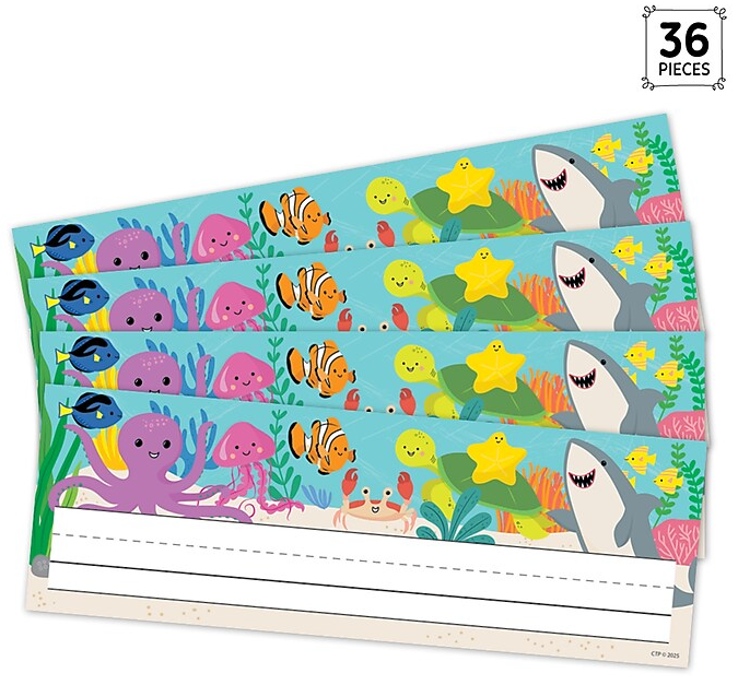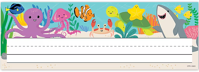 These Sea Friends Name Plates can be used to personalize student desks, cubbies, seats at the table, take-home bags, classroom cabinets, folders, and more! The fun, colorful design makes them versatile for use in a variety of classroom displays and themes. Tip: Laminate name plates and use as word bank labels or label learning centers. Name plates measure 9-1/2" x 3-1/4". Each pack includes 36 name plates.