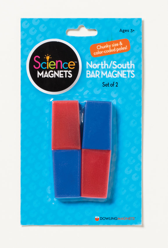 Learn all about magnetic polarity! Plastic encased ceramic magnets, each 3" tall. Color coded to indicate North and South poles. Ages 3+