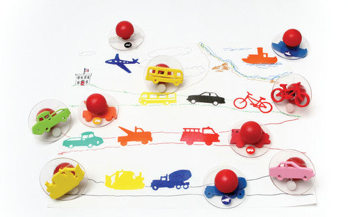 This set of 10 stamps is ideal for children's role playing. These 3" circular stamps fit perfectly into toddler's hands and help develop fine motor, social, emotional and cognitive skills. Set 1 of transportation includes a tow truck, tug boat, airplane, pickup truck, bus, fire engine, car, bicycle, earth mover, and a cement mixer.