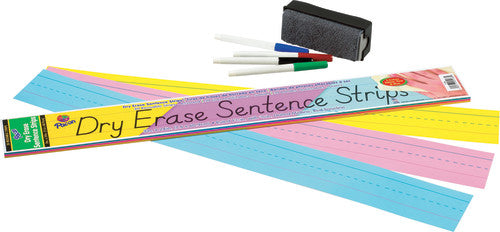 The dry erase surface makes these sentence strips convenient and reusable. Ruled 1 1‚ÅÑ2" with red baseline and 3‚ÅÑ4" dotted midline. Dry erase surface on one side. Assorted pack contains blue, pink and yellow. 30 strips per pack.