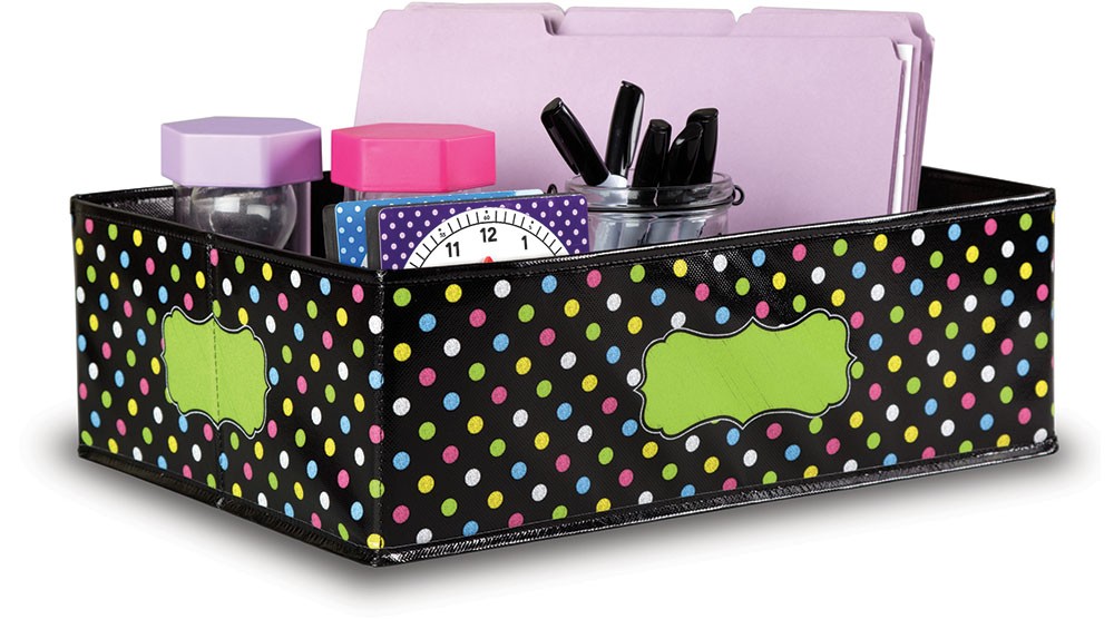 Classroom organization is easy with this polka dot storage bin! Keep manipulatives, books, notepads, educational toys, games, and supplies in this decorative organizer that features a write-on/wipe-off surface for convenient labeling and easy cleaning. The durable polka dot storage bins can also be folded for easy storage so you can take them out and use them year after year. Approx. 16" x 11" x 5"