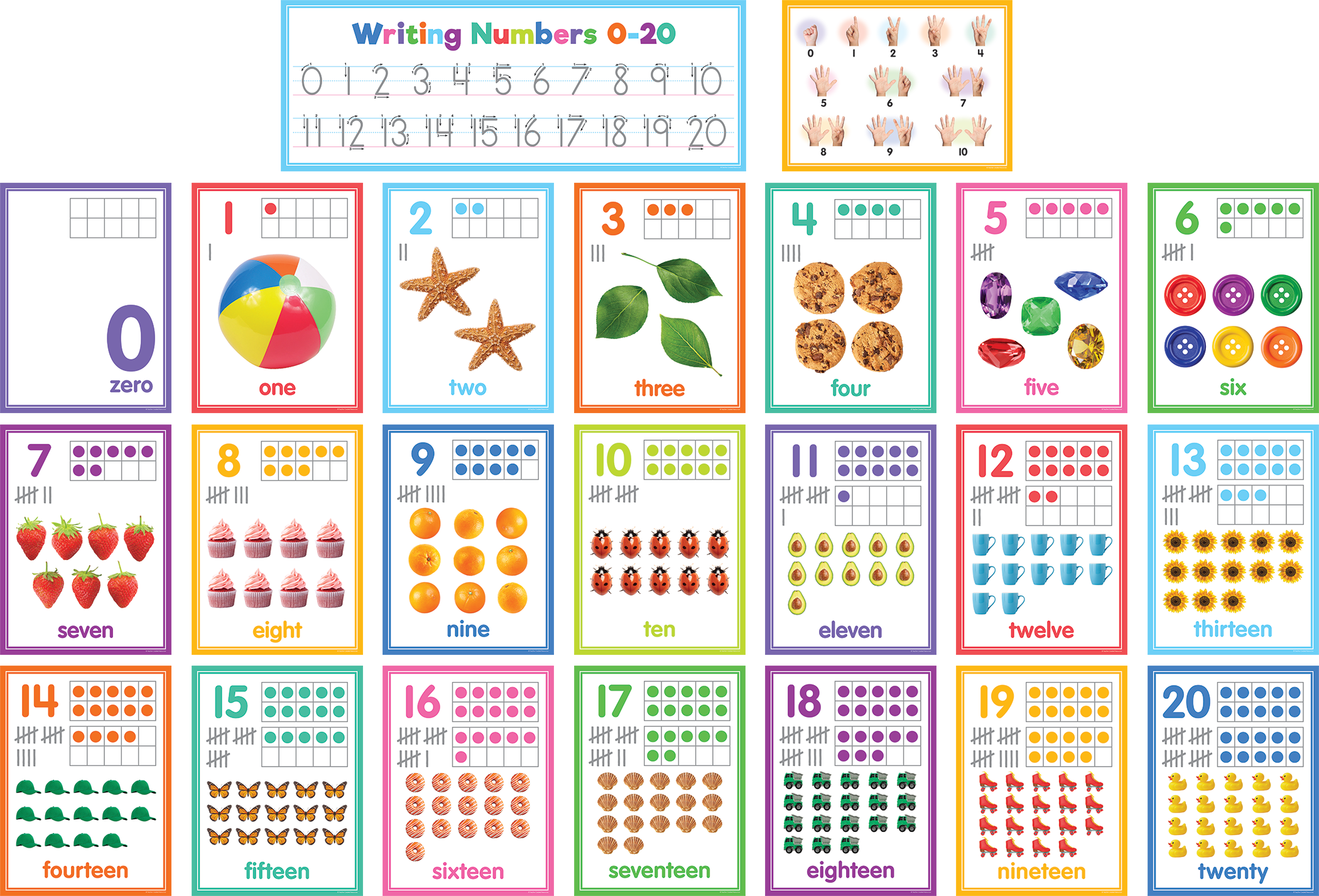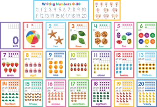 With the use of ten frames, tally marks, and engaging images, each number card offers valuable support for enhancing counting skills and deepening understanding of place value. Each number card measures 8-3/4" x 11-3/4", and the writing number card measures 23-3/4" x 8-3/4". 23 total pieces.Features: 21 number posters with 10 frames, tally marks, and number words. 1 poster showing how to count to 10 with fingers. 1 poster with directions for writing numbers 0Ð20. Bulletin board guide with set-up and activity suggestions. Shiny protective coating for durability.