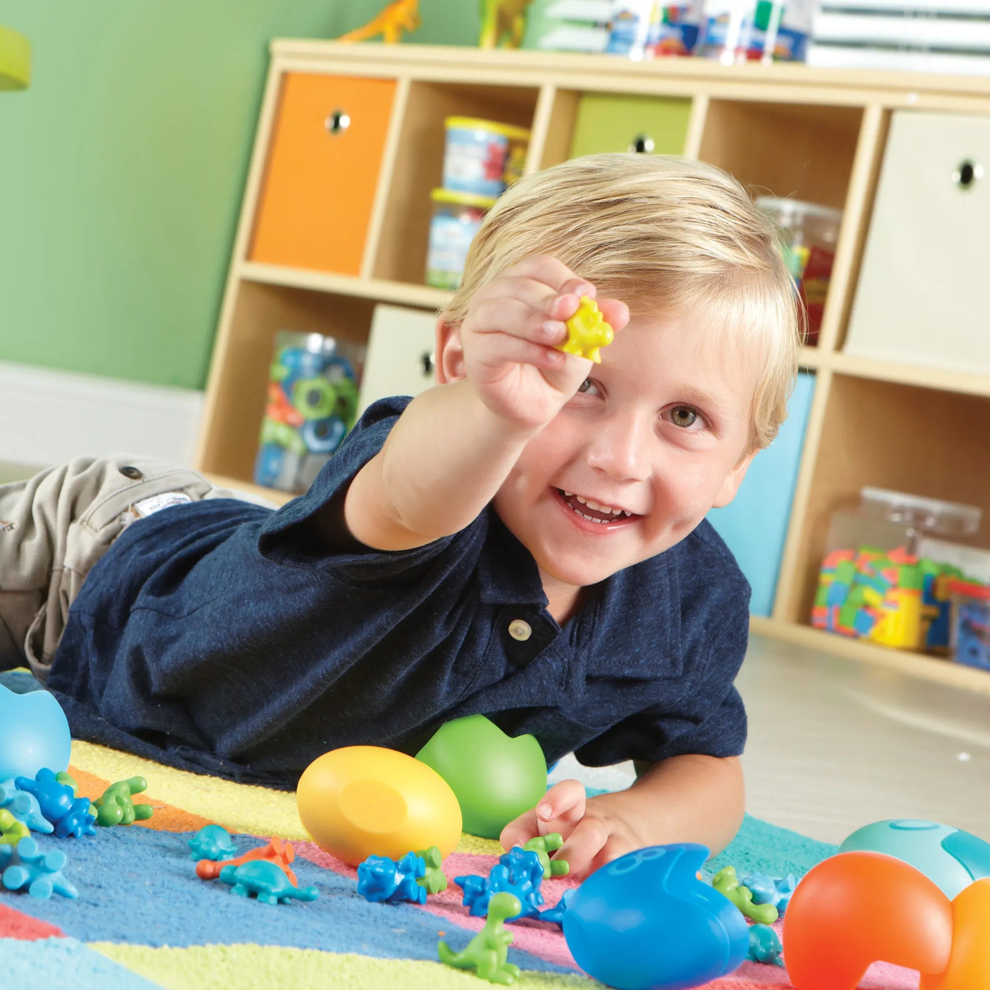 It’s a fun way for children to learn about counting and colors…while they play hide-and-seek! These little dinos tuck away inside the eggs for surprise counting fun. Each numbered and colored egg holds a corresponding number of dinos inside, so children learn about number correspondence too! Eggs measure 3"H.