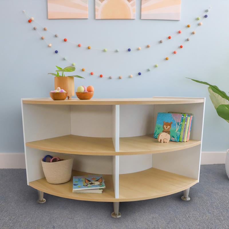 Tired of losing classroom storage space to corners, columns or jogs? Need to define a flexible activity area in an open classroom space? Solve both challenges in elegant modern style with curved back cabinets from the elevatEDª Collection! Contrasting white and textured white oak panels form pleasing curves offset by brushed nickel legs with integrated pads to protect floors. The back of the 27H cabinet curves in to negotiate a column, corner or other monument and two fixed shelves in front provide ample storage compartments. The cabinet is deeper to provide stability and more storage capacity. Combine with other storage cabinets in the sophisticated chic and thoroughly modern elevatEDª Collection to create a half-round, horseshoe, S-shape or other configuration! Ships fully assembled.