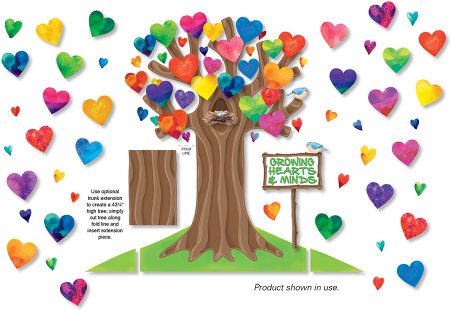 Promote a growth mindset environment with this fun, colorful set perfect for any time of the year. Set includes a 22″ x 33¾” (55.9 x 85.7 cm) tree, a 9½” (24.1 cm) trunk extension, two 6¾” (17.1 cm) grass extensions, a sign and post, birds and a nest, and 56 precut hearts. The 57 bonus mini hearts and reproducible activity sheet further reinforce growth mindset through hands-on, “maker” activities. For year-round appeal, use the tree with student photos, handprints, seasonal embellishments, or purchased accents. 65 pieces.