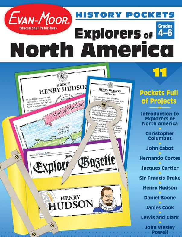 History Pockets-Explorers of North America, Grades 4–6+, contains eleven discovery pockets. The introduction pocket gives an overview of exploration throughout North America. The other pockets feature ten famous explorers and their journeys.