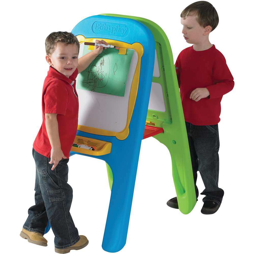 This sturdy lightweight indoor/outdoor easel is easy to set up or fold away. Both sides have a magnetic/dry erase board, clips to hold paper for drawing or coloring, and a handy tray for holding your markers, crayons, or magnetic toys (not included). When easel is standing, there is a storage shelf in the middle. 21"W x 30 1⁄2"D x 43"H. Additional shipping charges apply.