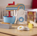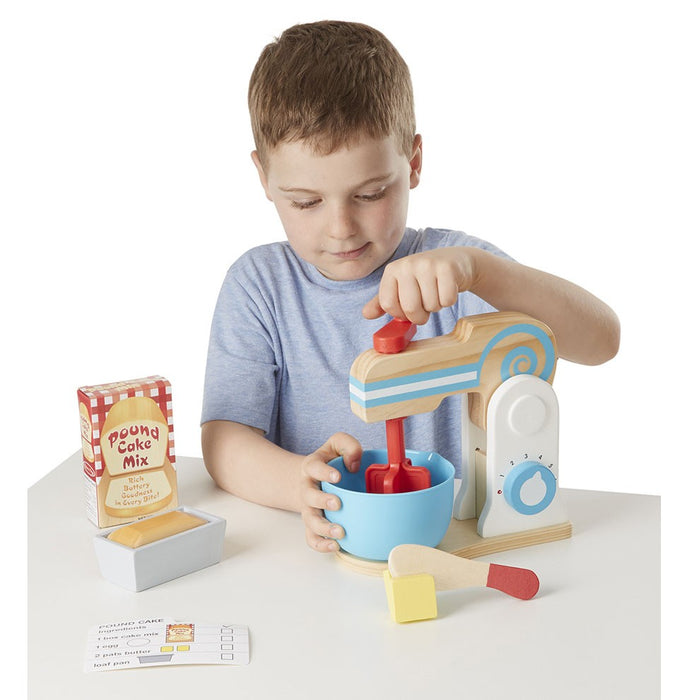 Mix up some delicious pretend-play fun with this realistic wooden mixer. Turn dials to "adjust speed" and use the crank to turn the bowl that fits the mixer. Wooden ingredients include two pats of butter and a two-part egg, both of which have self stick tabs that can be sliced through with the child-friendly wooden knife. Follow the directions on the recipe card to make pound cake - the set includes a pound cake mix box, pretend pound cake loaf, and a cake pan. Kids three and older will love cracking, slicing, blending, and serving up pretend baked treats with this set that encourages creative thinking and imaginative play and promotes memory and number skills.