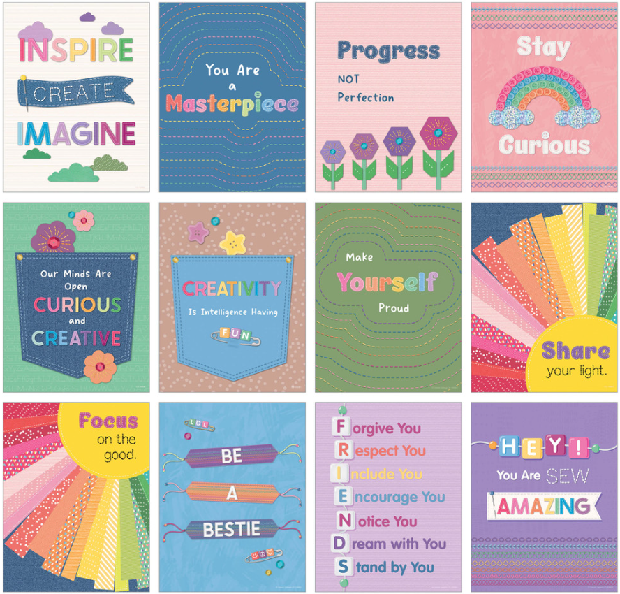 Perfect for year-round bulletin board, cork board, and white board displays, the inspirational posters set includes 12 posters measuring 8.5" x 11”. Each colorful poster features a positive affirmation such as “Progress not perfection” and “Focus on the good” to foster a growth mindset, as well as quotes like, “Be a bestie” to inspire an inclusive environment.