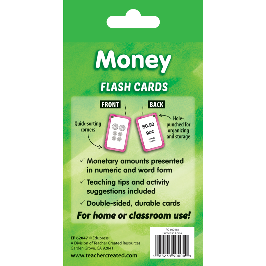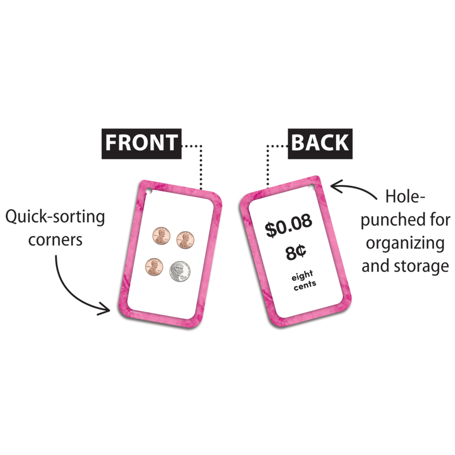 Teach and review money individually, in groups, or with the whole class! Each flash card set contains a collection of full-color, high-interest student cards as well as instructions and tips for the teacher or parent, suggested activities, and additional blank cards. Each card has a hole in the top corner that can be fit with a ring or string to help with organization and storage. Additionally, each card has one corner that is shaped differently than the others. By lining up the non-rounded corners, the flash cards can quickly be faced in the same direction. When applicable, flash card sets include answers in small print on the reverse side of each card. Each card measures 3⅛" x 5⅛". 56 double-sided cards per pack.