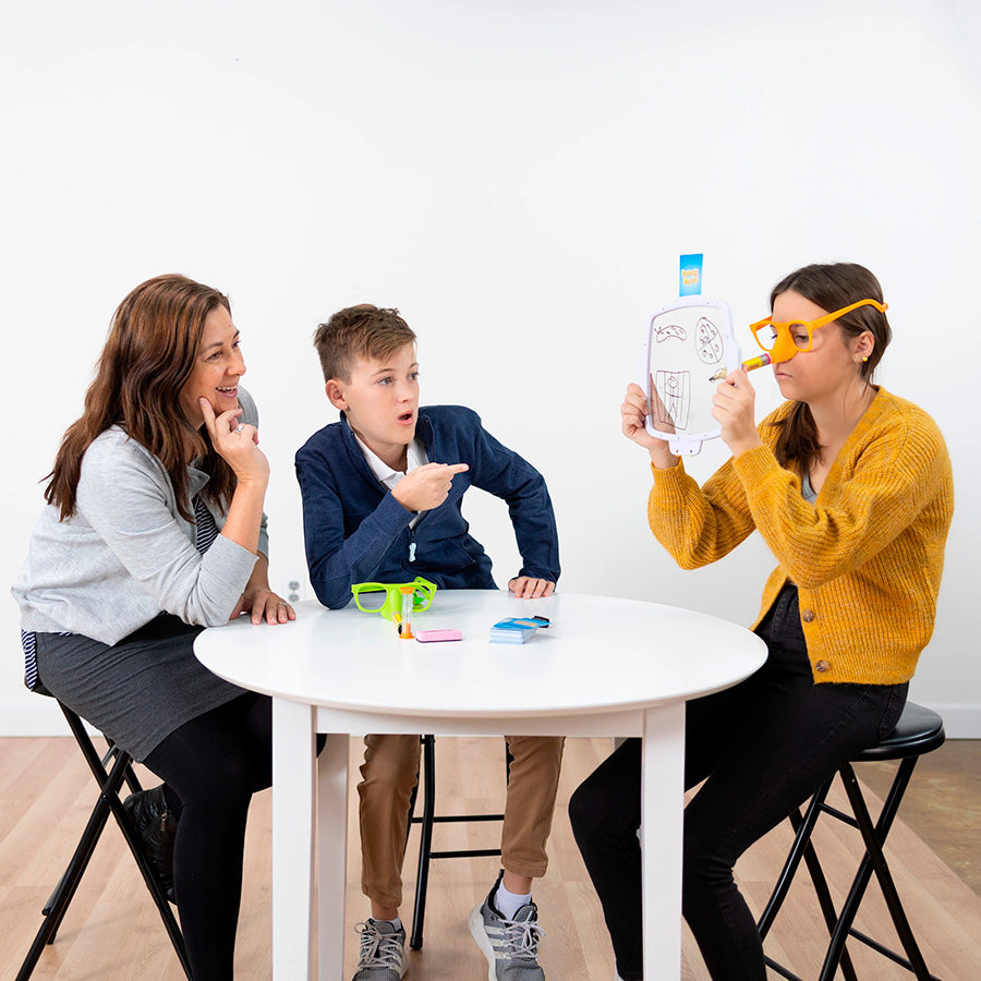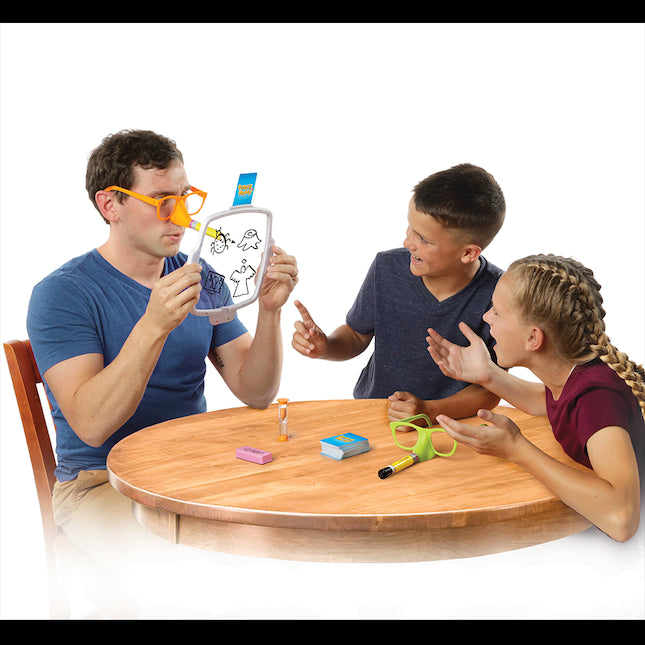 • Includes erasable drawing board, 2 pairs of pencil nose glasses (green, orange), erasable marker, eraser, 90 object cards with 6 objects each, sand timer