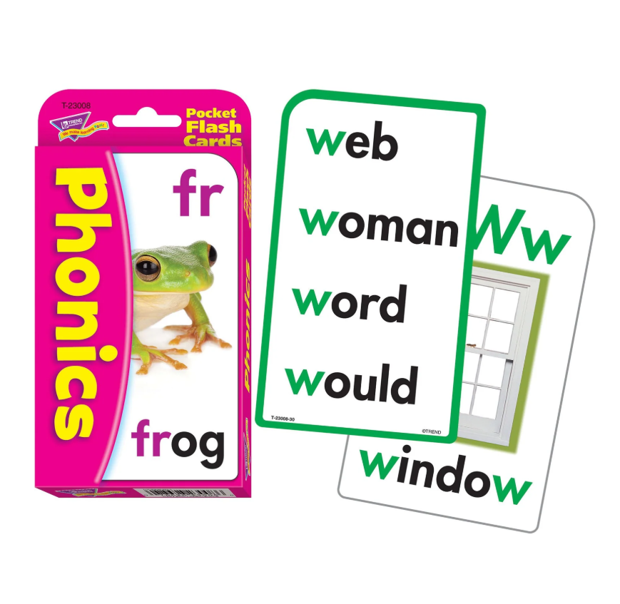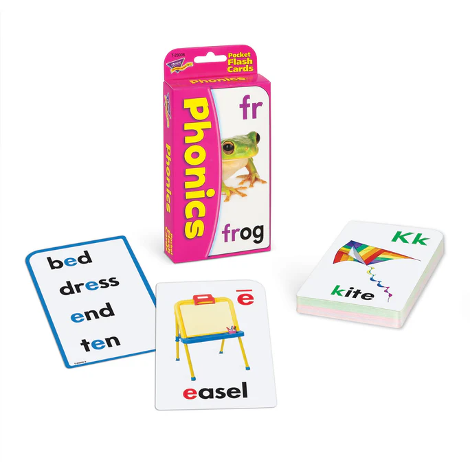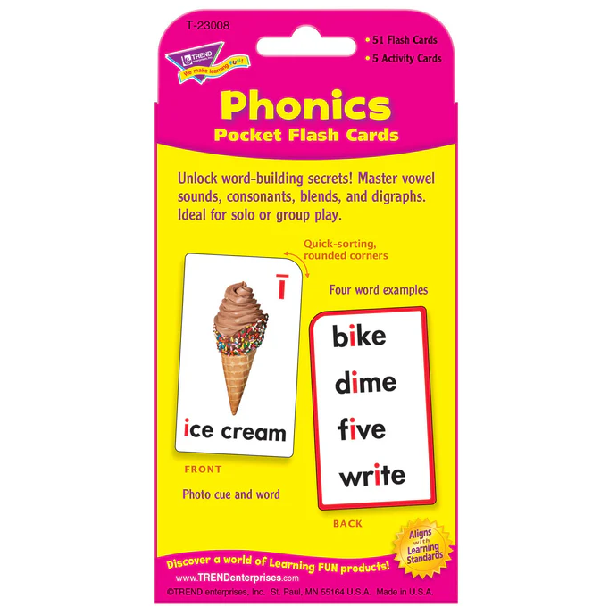 • Master vowel sounds, consonants, blends, digraphs. Photo cue on front; additional examples on back.