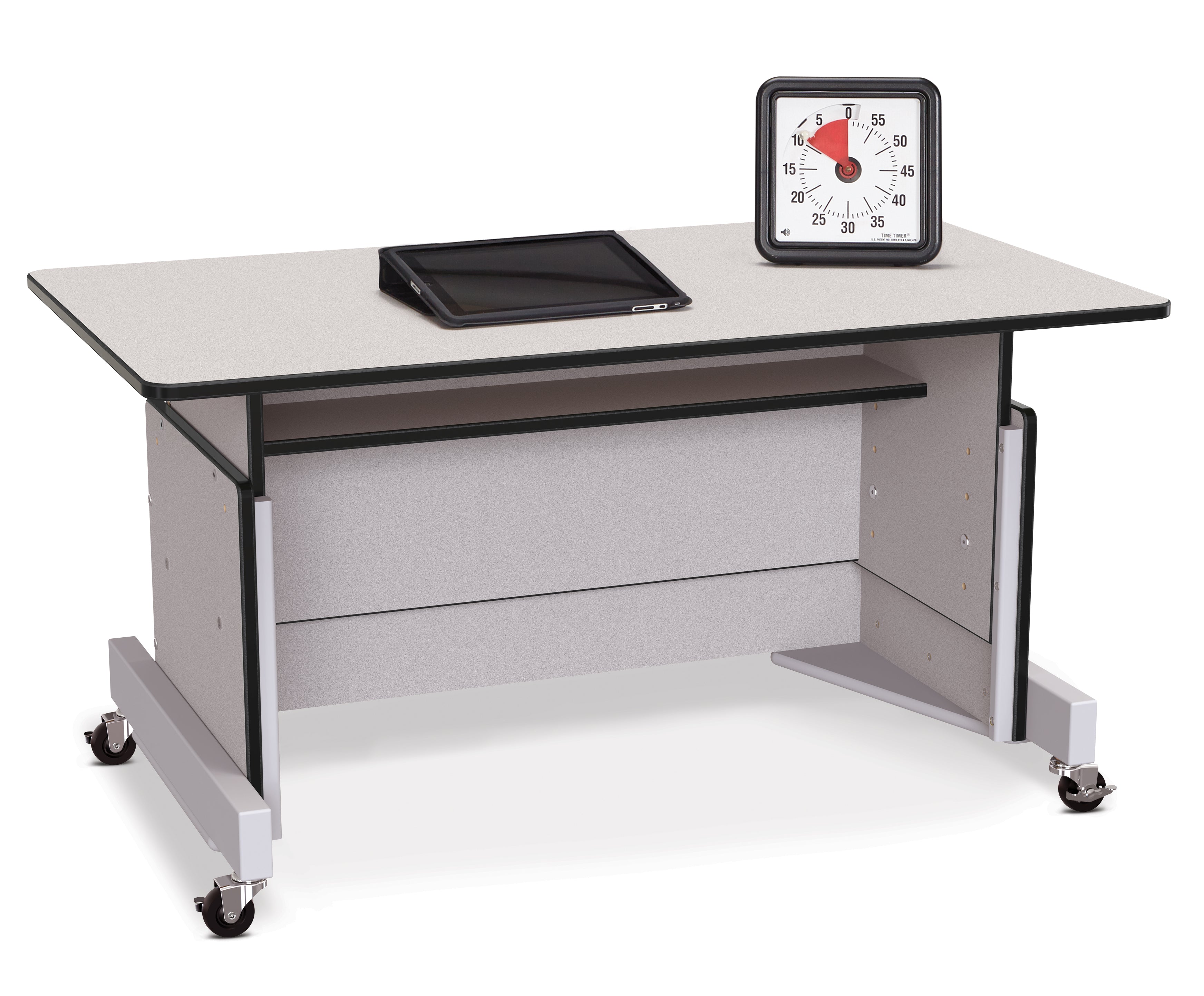 This desk can be adjusted in two-inch increments accommodating pre-school students through adults. Grommet and fully enclosed back help hide unsightly cords and wires. Storage shelf under easy to clean laminate top provides space for computer accessories. Constructed of double-sided freckled gray laminate with black TRUEdge.KYDZSafe edges. KYDZStrong construction. TRUEdge. Choose from multiple tabletop and TRUEdge color combinations. Heavy-duty, locking casters for mobility. Grommet for cords. Triangular gussets for added strength. GREENGUARD Gold certified. CARB II & CPSIA compliant..Product Height (inches):18-30Product Width (inches):42Product Depth (inches: 24