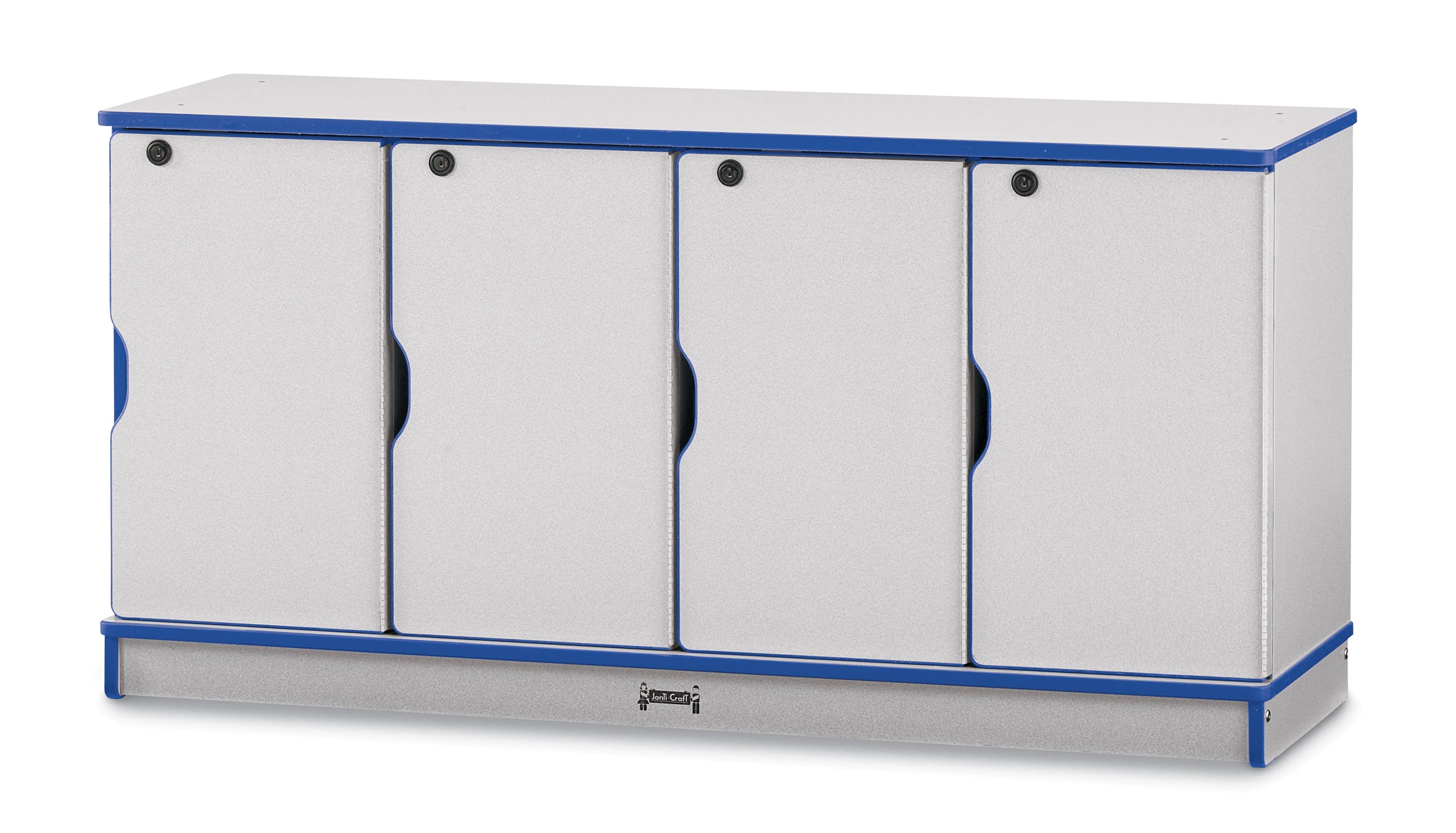 Keep take home items secure for four children with this locker unit. Different locks and keys are provided for secured lockers. Individual lockers are 10.5" wide x 12.5" deep x 20" high. Stacked lockers must be fastened to a wall. Note: The units have fouKYDZSafe edges. KYDZStrong construction. KYDZHinges. TRUEdge. Constructed of 5/8” thick freckled-gray Thermally Fused Laminate (TFL). Stationary. See cleaning recommendations at www.jonti-craft.com/cleaning.