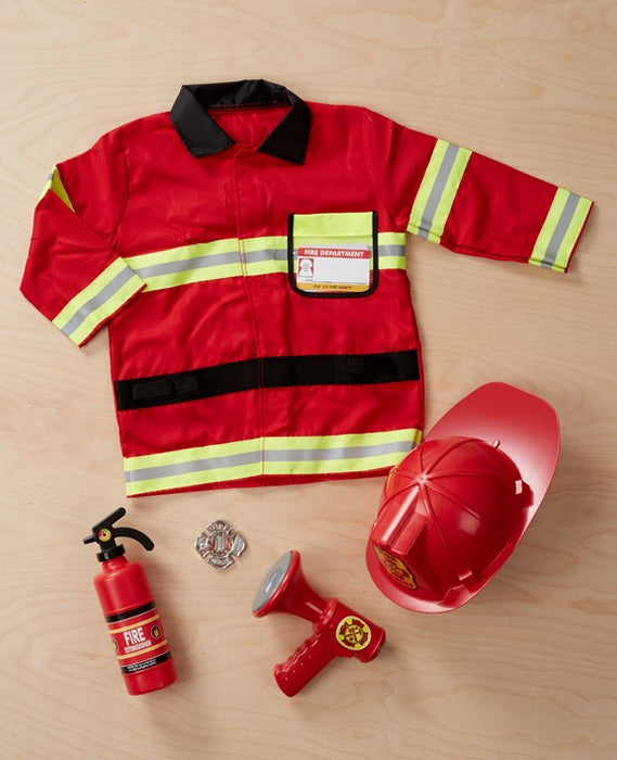 Here is everything an aspiring firefighter needs in an emergency: a bright red, machine-washable jacket trimmed with reflective material, a fire chief helmet, a "fire extinguisher," a bullhorn with sound effects, a shiny badge, and a name tag to personalize.
