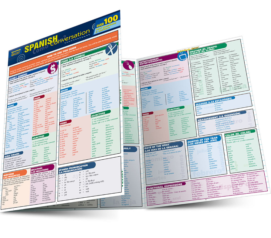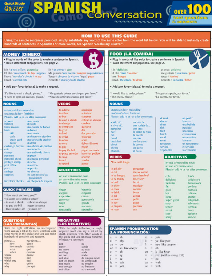 Want to be able to hold up your end of a conversation that's spoken in Spanish? You can't go wrong with our comprehensive Spanish Conversation guide now in a special 3-panel Quizzers" edition for even greater ease of use. A series of do-it-yourself exercises on the back cover each color-coded section of the guide, thus helping you speak about subjects ranging from the weather to entertainment. Achieving Spanish fluency will be a snap!
